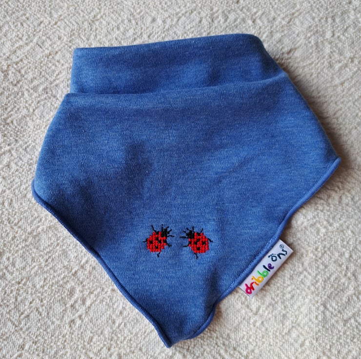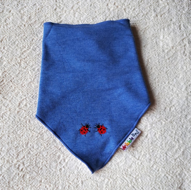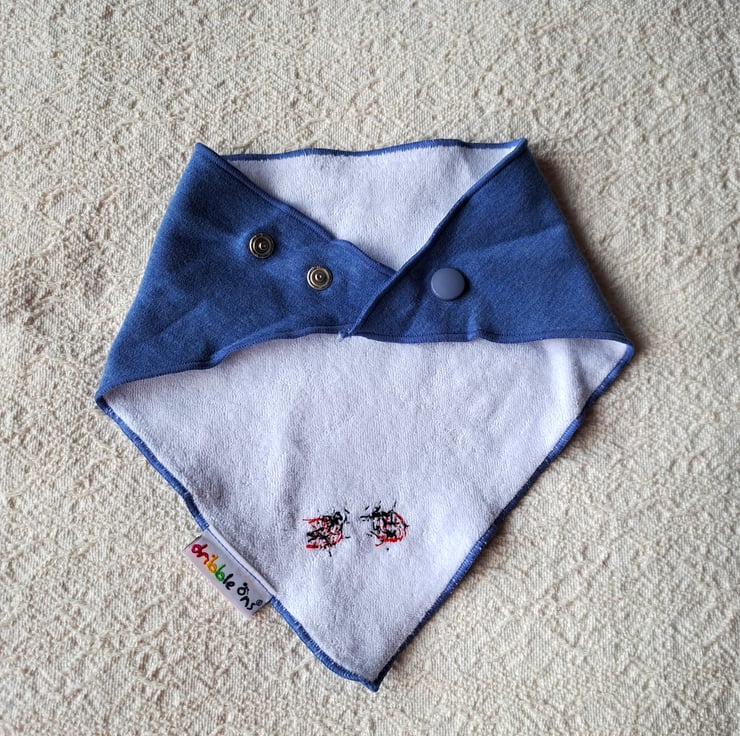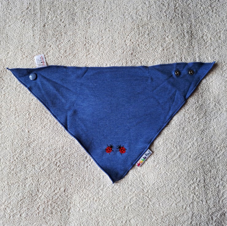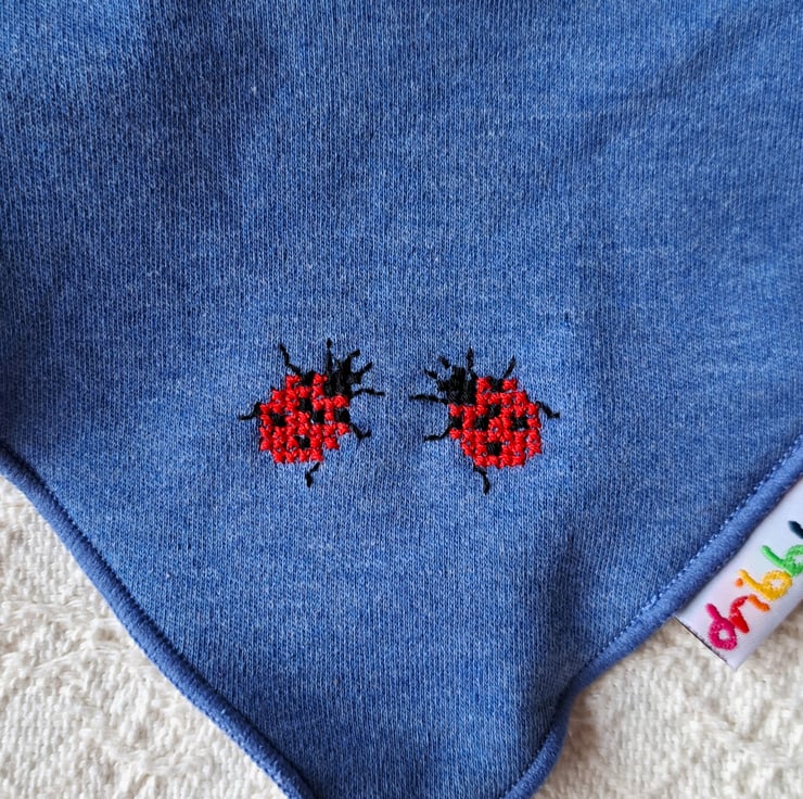 I have hand stitched two bright red ladybirds on the lower corner of this lovely denim blue triangular bib by DribbleOns. The bib is adjustable, having two press studs at the back of the neck. The front is 100% cotton, and the back is white cotton polyester towelling. It can be machine washed.