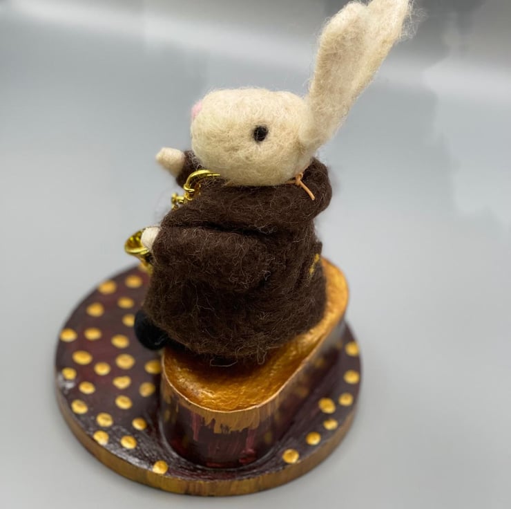Saxophone-playing bunny. Made with Corriedale silver wool, with a wire armature. Bench made with cement; painted with acrylic and varnish. Indoor display only. Avoid direct contact with water or heat. To be kept out of reach of children and animals. All handmade in my studio in UK. Custom-made order available, in various colours. Please email me for details.