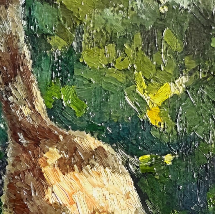 Its bright green eyes are locked onto something unseen, full of curiosity and focus. Meanwhile, thick impasto brushstrokes create rich texture, making the fur look lifelike and adding depth through light and shadow.