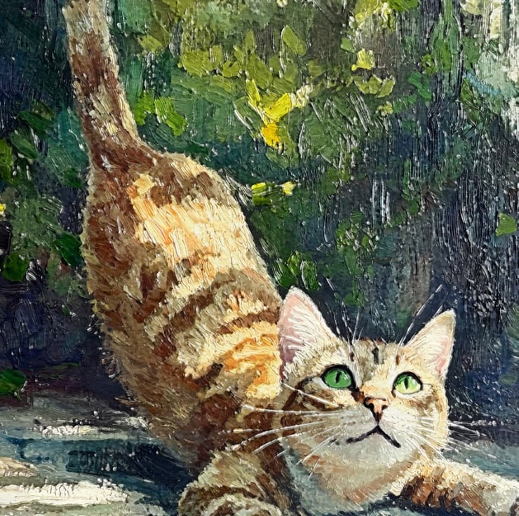 This painting captures the playful spirit of a tabby cat mid-pounce.