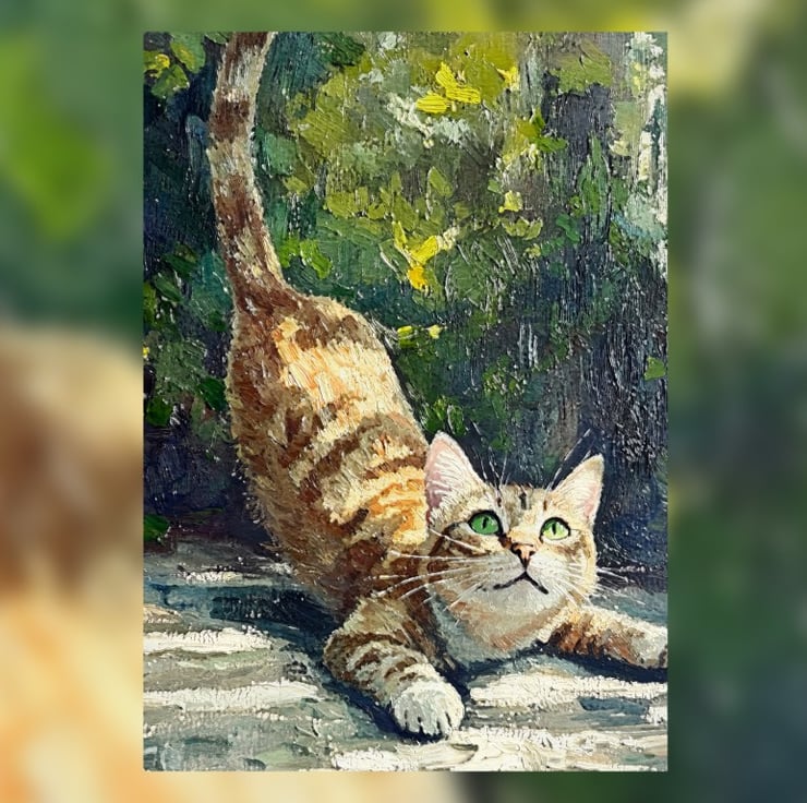 At the same time, the lush green background contrasts beautifully with the cat’s warm, earthy coat, giving the piece a natural and inviting feel. The bold colors and dynamic composition bring the cat’s movement to life, making it feel as if it could leap off the canvas.