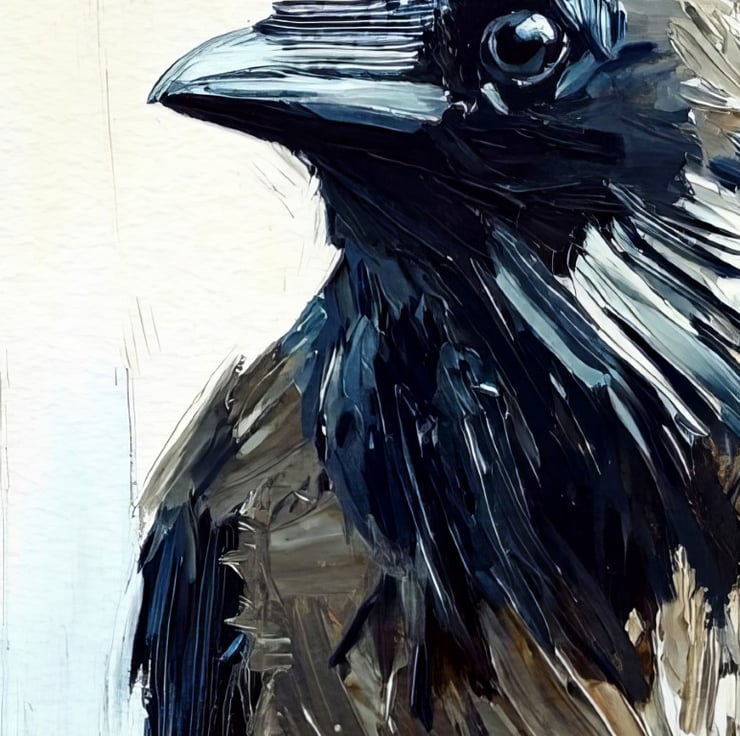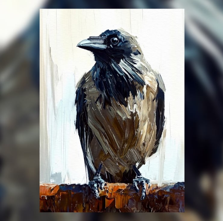 This painting beautifully captures the mysterious charm of a crow with bold, expressive brushstrokes.