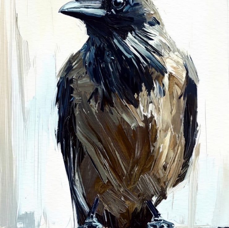 As deep black and earthy brown tones contrast against a soft, muted background, they immediately draw attention to the crow’s piercing gaze and intricate feather details. Meanwhile, the thick impasto technique adds rich texture, making the artwork feel almost three-dimensional. As a result, the painting exudes a sense of depth and realism, pulling the viewer into its striking presence.