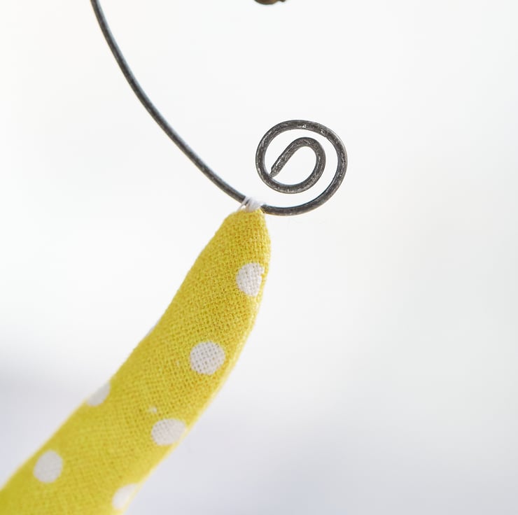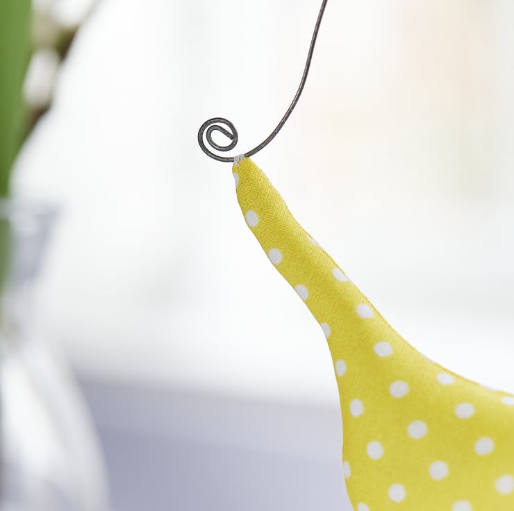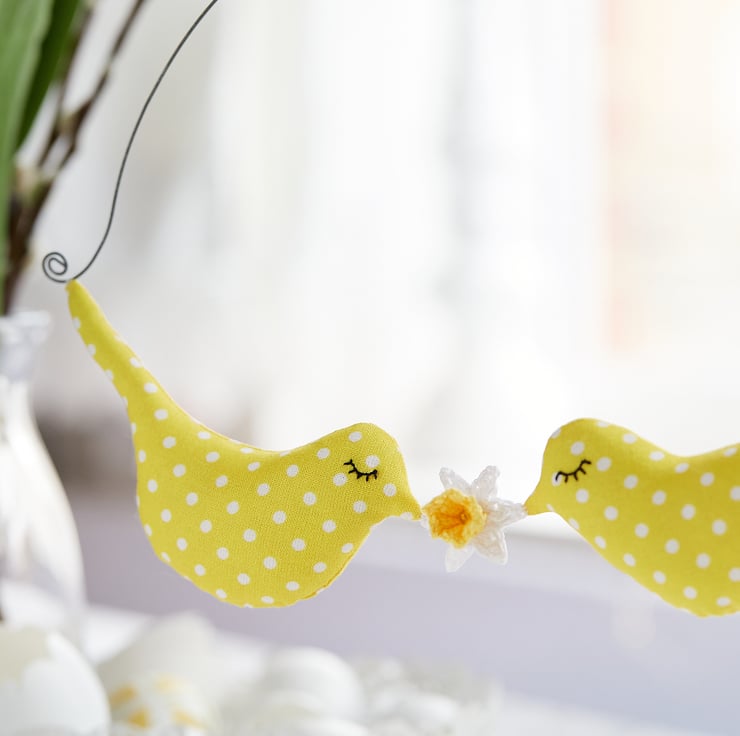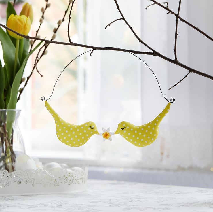 Two birds in sunny yellow with jolly white dots, carrying a miniature daffodil bloom, arranged as a lively spring hanging ornament - they are perfect for adding a colour spot of whimsy to your favourite spaces.