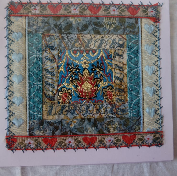 I am using up a range of unused quilt blocks, unfinished embroideries and various bits of ribbon and fabric to make a range of greetings cards.