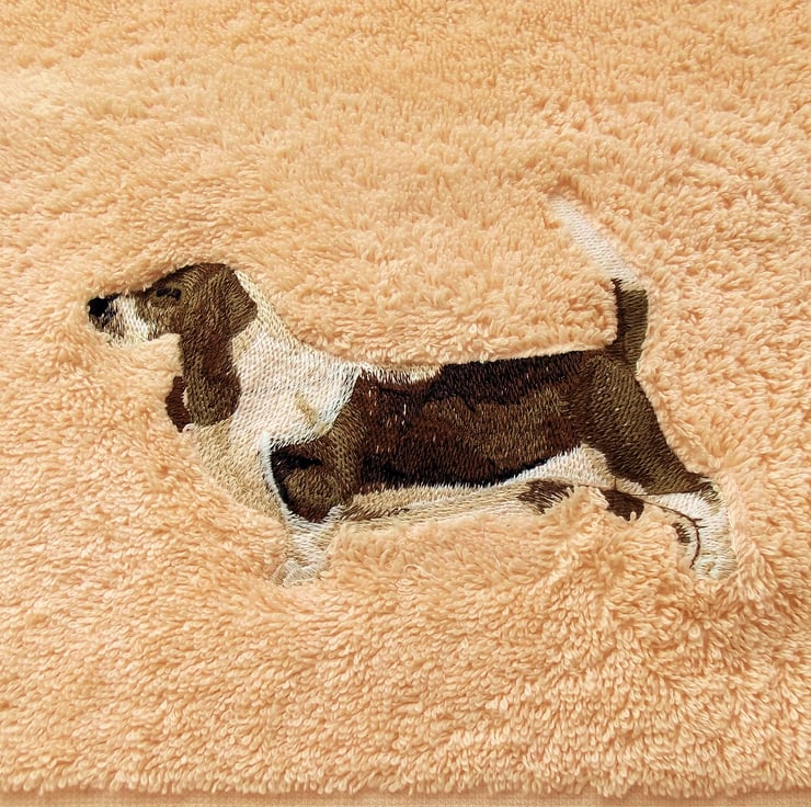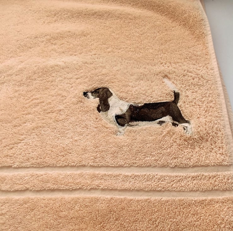 Machine Embroidered by me. Basset Hound Dog design machine embroidered Bath Towel. Peach. Towel measures 70cm x 137cm. 100% Turkish Cotton. t6