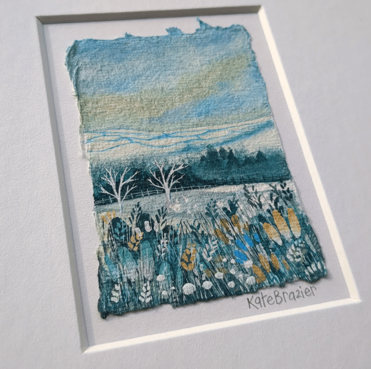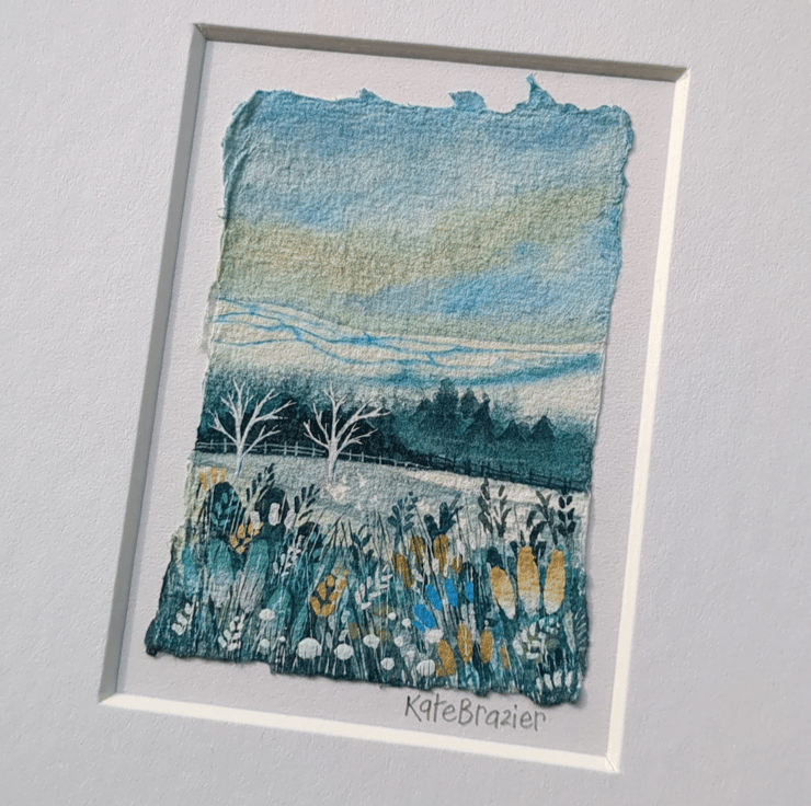 This piece is created using gouache paint on handmade Khadi paper, it has been worked into with water soluble pencils and Luminance colourfast pencils. It is then held in place with artist quality Neutral pH adhesive and float mounted in a custom mount.