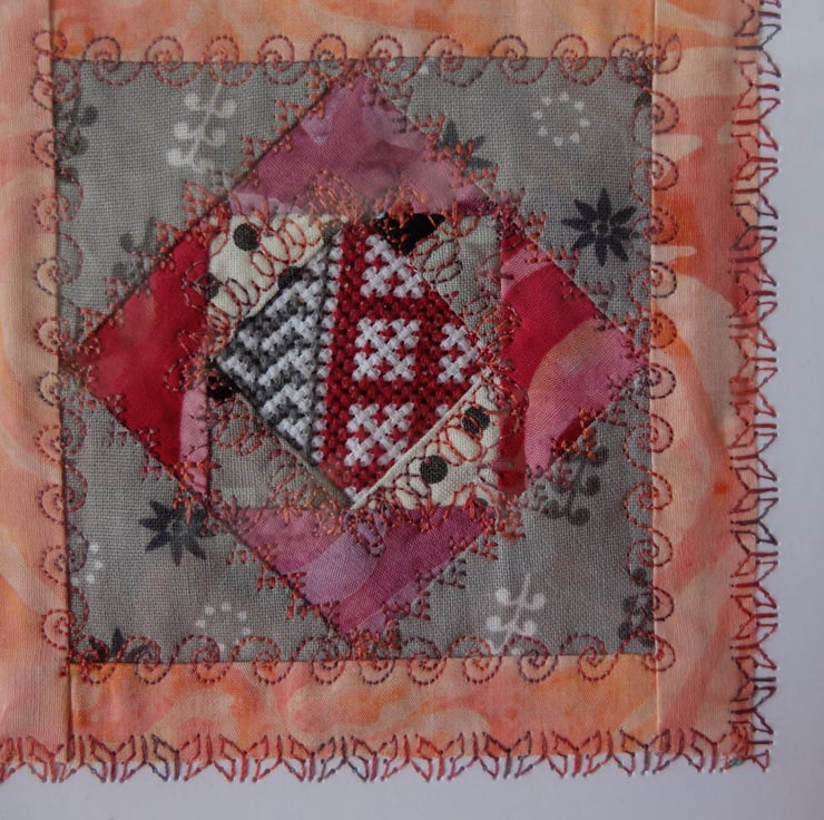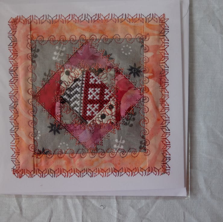 Hand made greetings card, quilt block around fragment of cross stitch