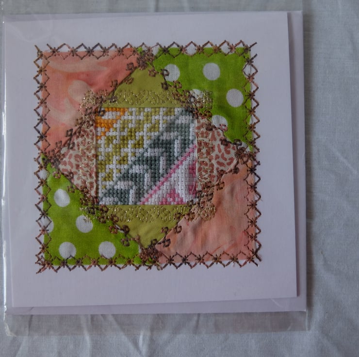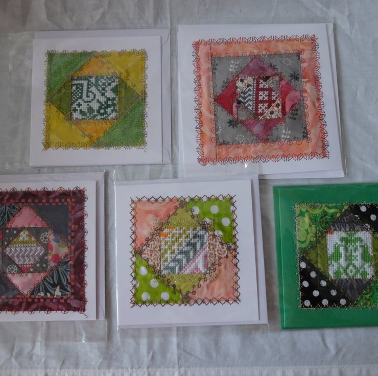 I am using up a range of unused quilt blocks, unfinished embroideries and various bits of ribbon and fabric to make a range of greetings cards.