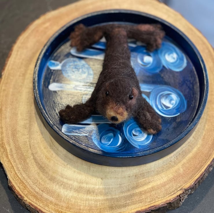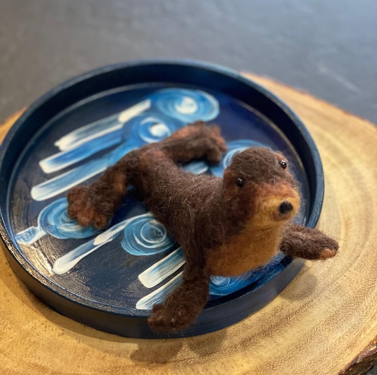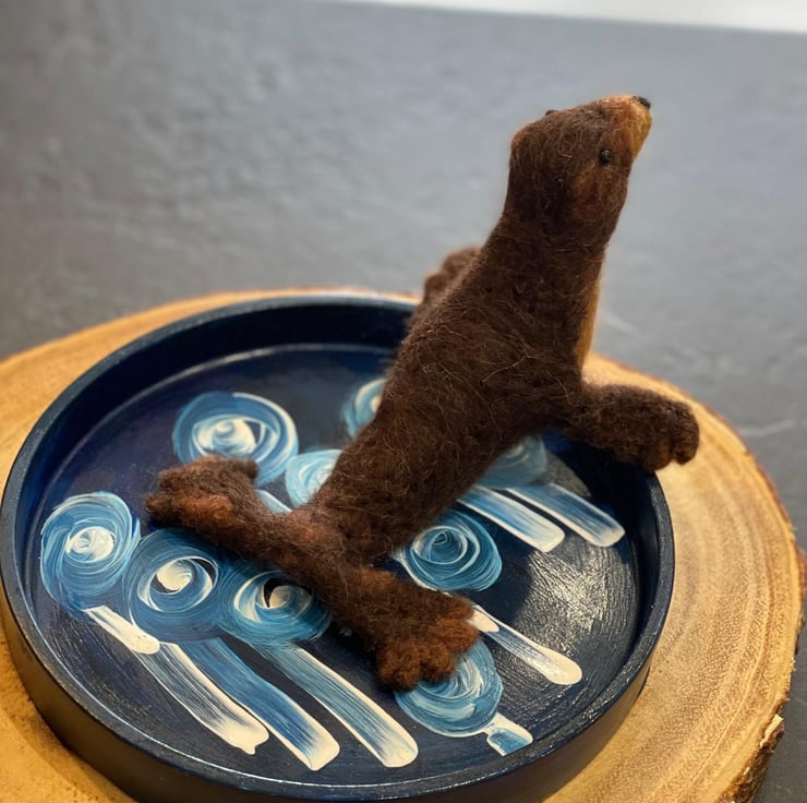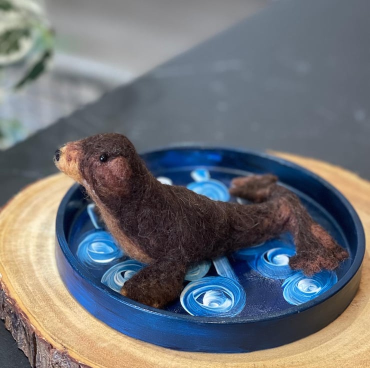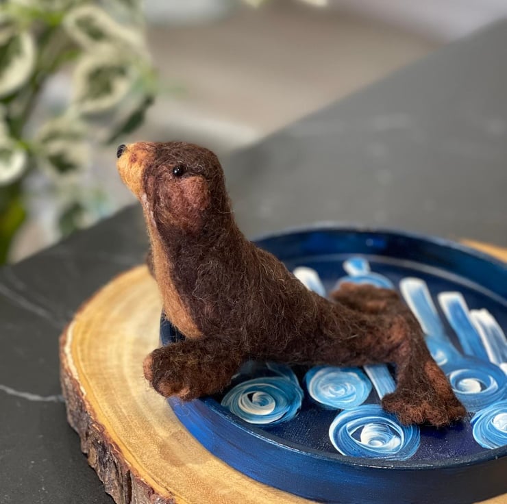 Sunbathing sea lion handmade with wool and wire armature. Round trinket dish handmade with cement and painted with acrylic paints. Indoor display only. Avoid direct contact with water or heat. To be kept out of reach of children and animals. All handmade in my studio in UK. Custom-made order available, in various colours. Please email me for details.