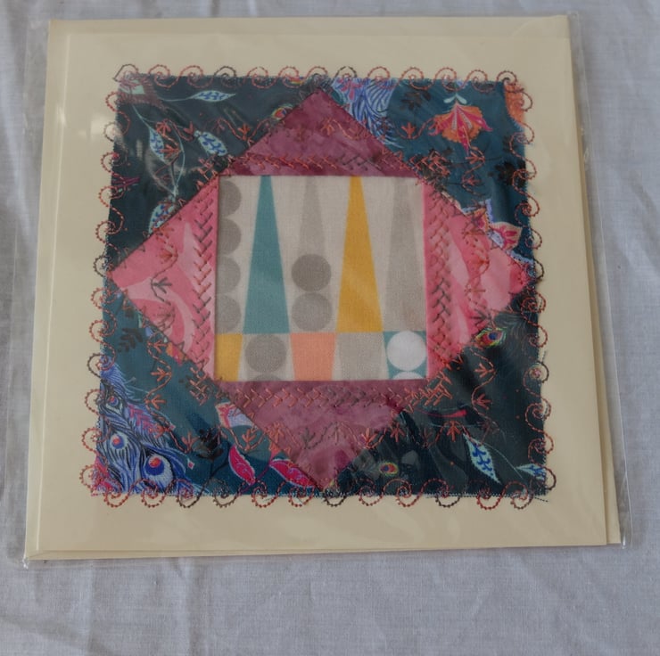 I am using up a range of unused quilt blocks, unfinished embroideries and various bits of ribbon and fabric to make a range of greetings cards.