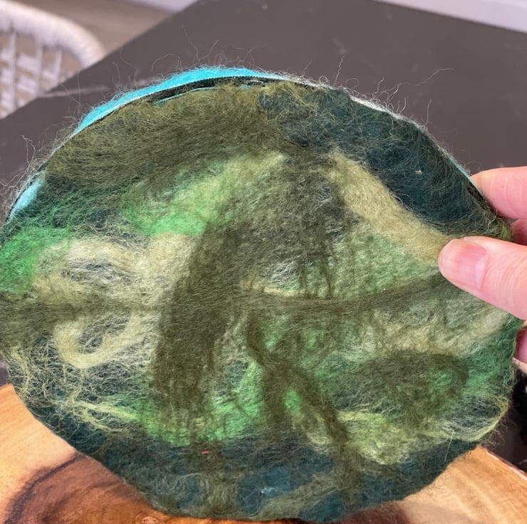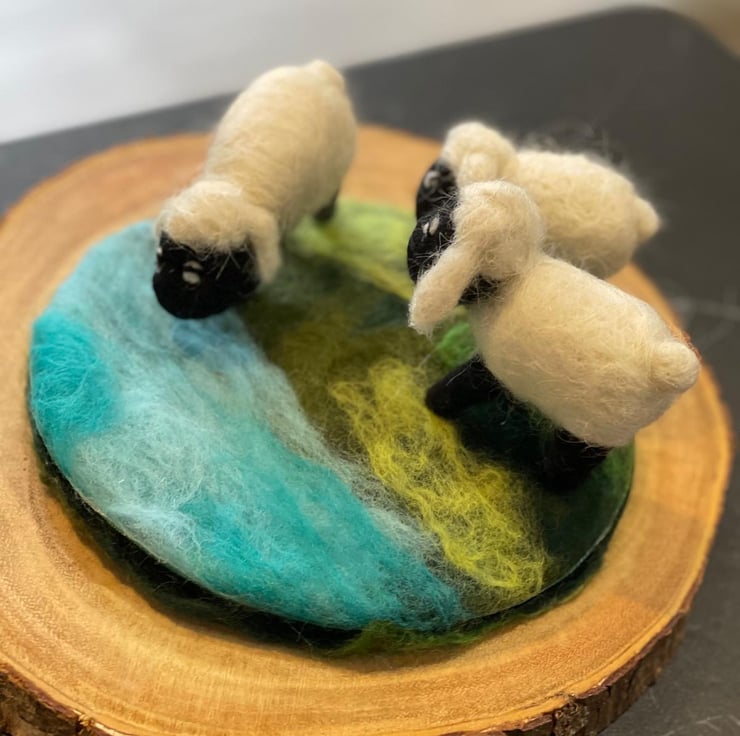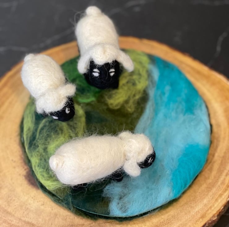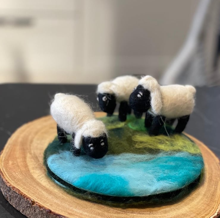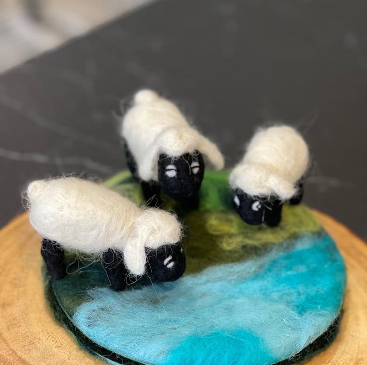 Handmade with wool. Three sheep standing on a handmade cement trinket dish cover with wet felted pasture and brook. Indoor display only. Avoid direct contact with water or heat. To be kept out of reach of children and animals. All handmade in my studio in UK. Custom-made order available, in various colours. Please email me for details.