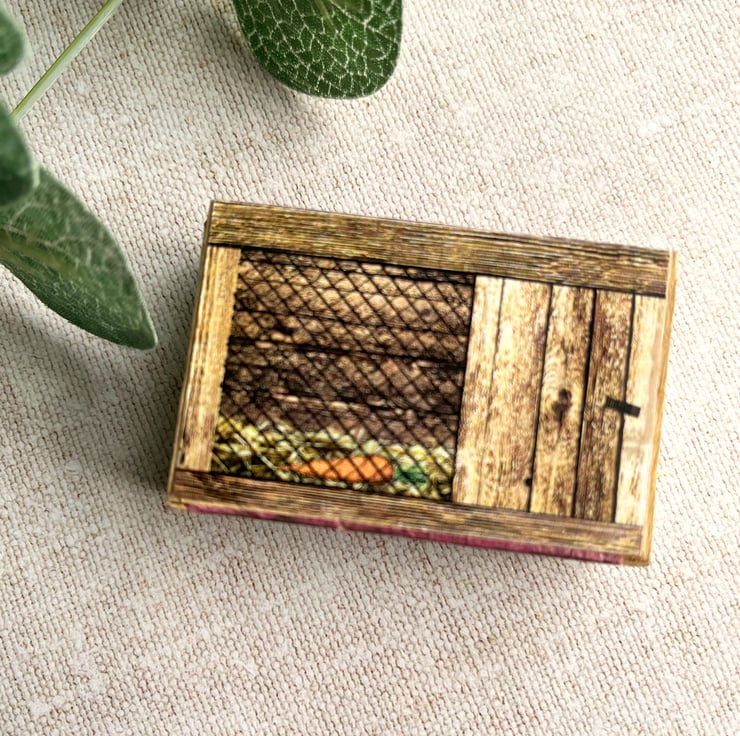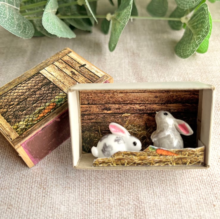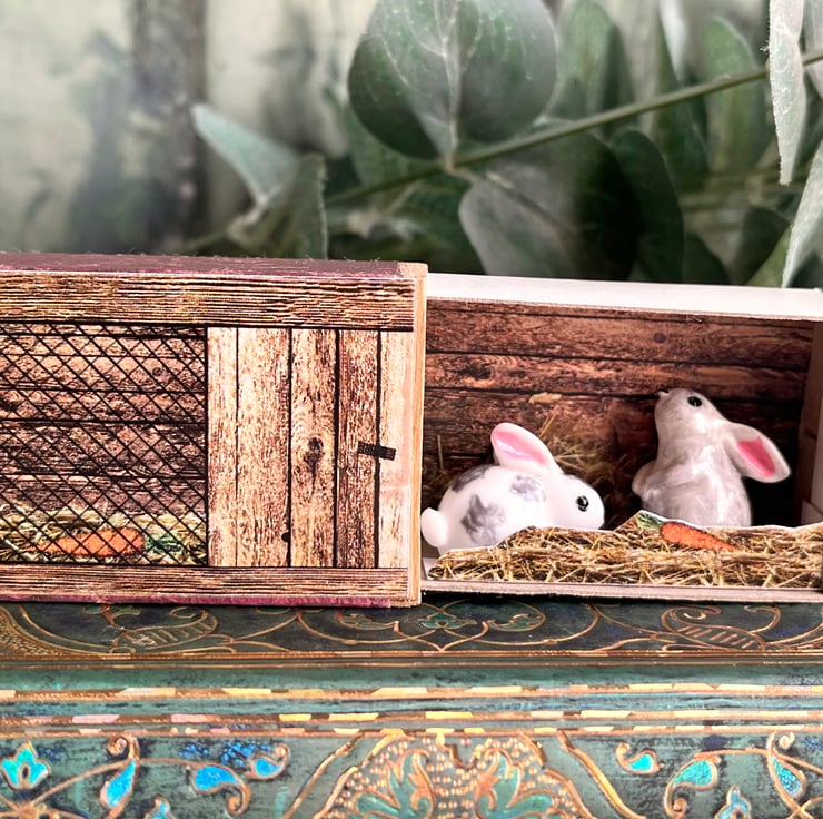 This diorama is housed inside a vintage matchbox. I've covered the top label and made the scene inside using colour paper copies backed with card. Apparently rabbits don't like to live on their own so I've added two tiny resin ones which I've painted with a very small brush!