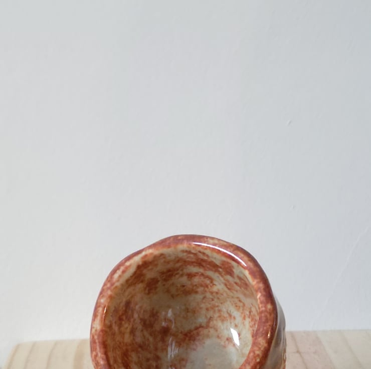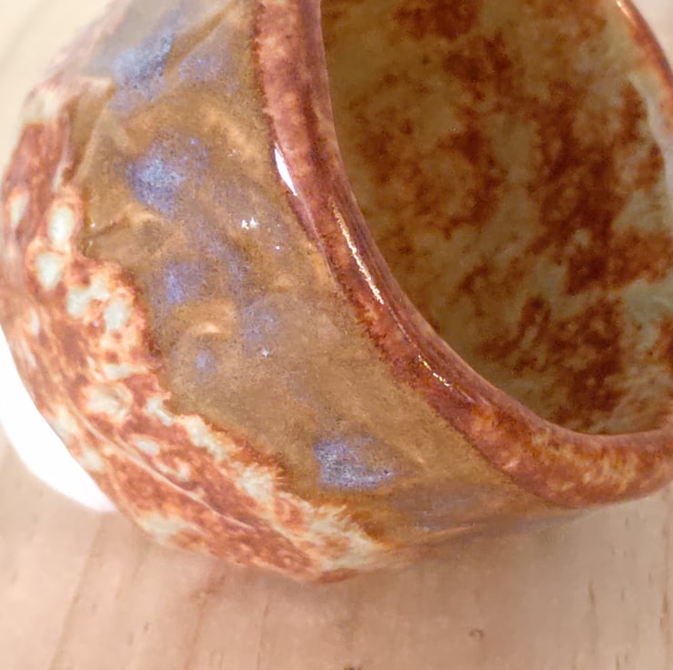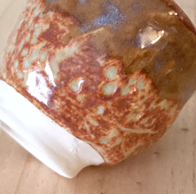 A rich blend of warm brown, golden, and creamy tones dominated by deep reddish-brown hues, interwoven with patches of soft, creamy beige and hints of muted green. Some areas are smooth and glossy, reflecting light beautifully while others have a more matte, textured finish, creating a natural, weathered effect. This organic interplay of colours and textures gives the cup a distinctive, handcrafted character.