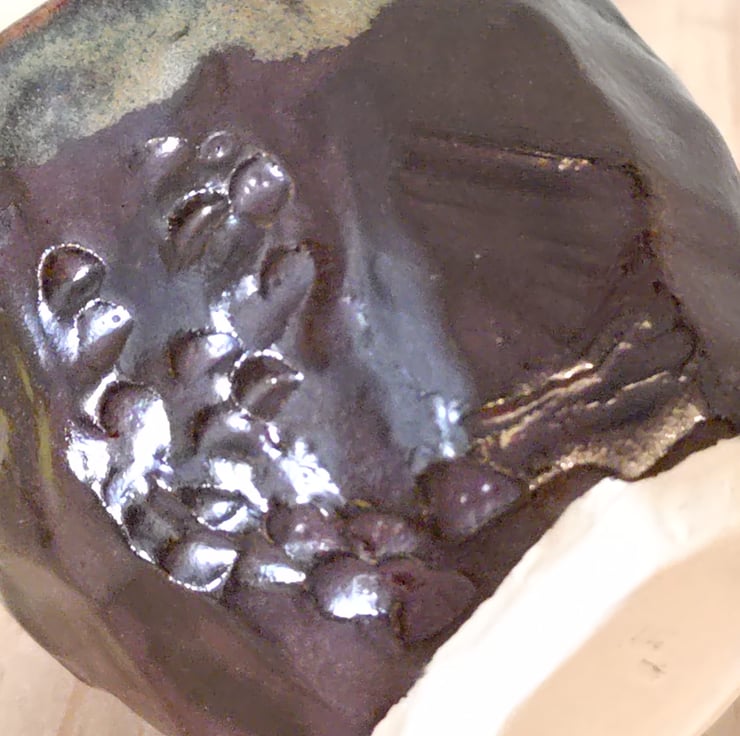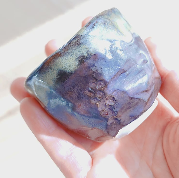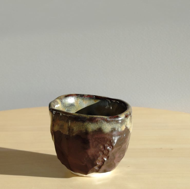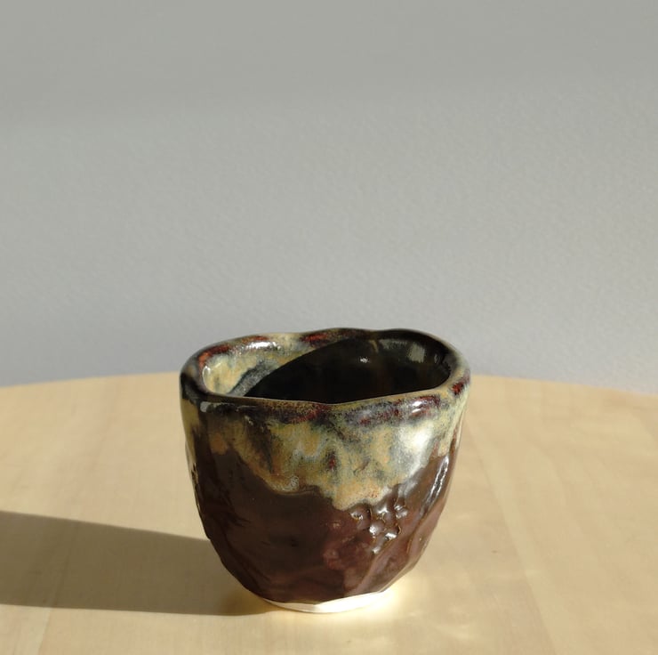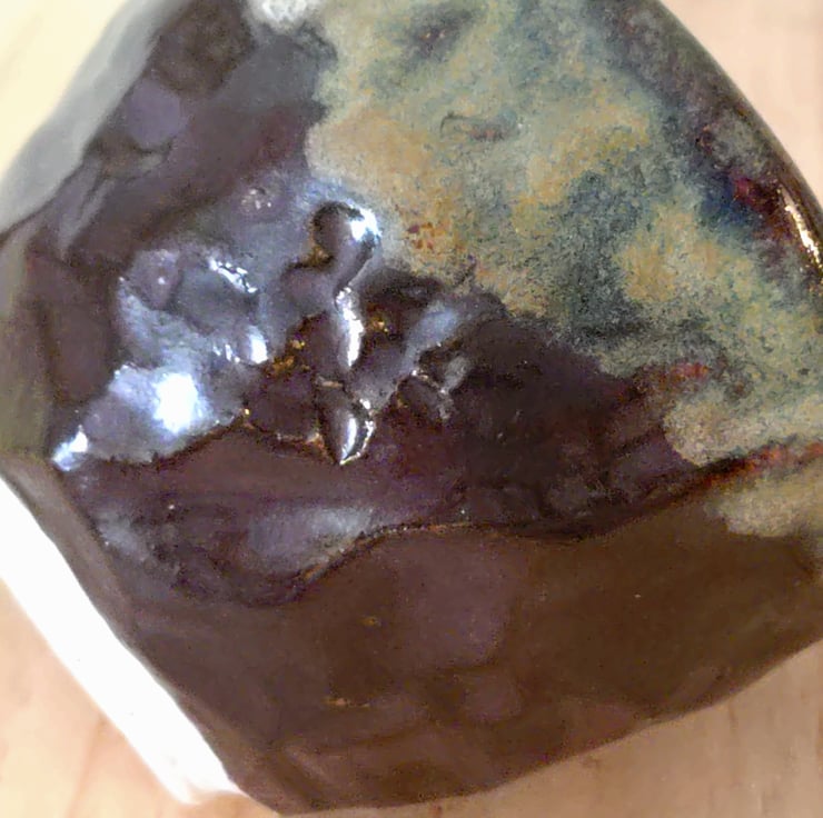 Rustic, handcrafted appearance with a rich blend of colours. The lower half is a deep, purplish chocolate brown, giving it an earthy and grounded feel. The upper portion transitions into a mix of dark green and muted olive tones, creating an organic, natural look. The rim of the cup has a slightly glossy sheen, reflecting light subtly.