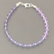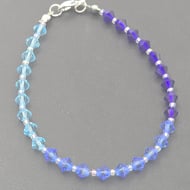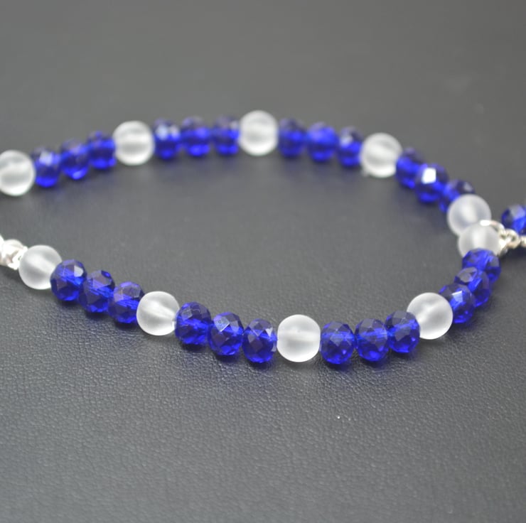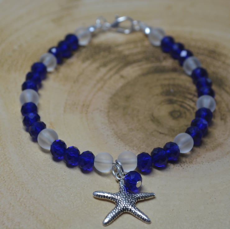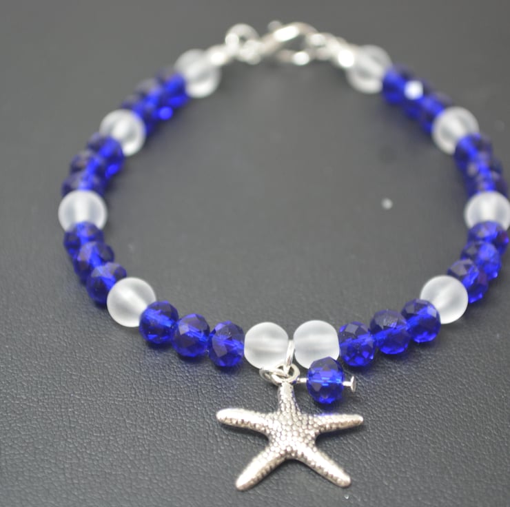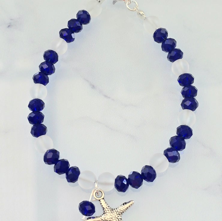 The bracelet has been made using dark blue fire polished faceted glass beads and matt white frosted beads. The bracelet has a silver metal starfish charm and a smaller dark blue bead that dangles from the centre of the bracelet.