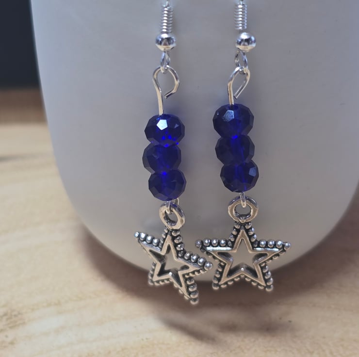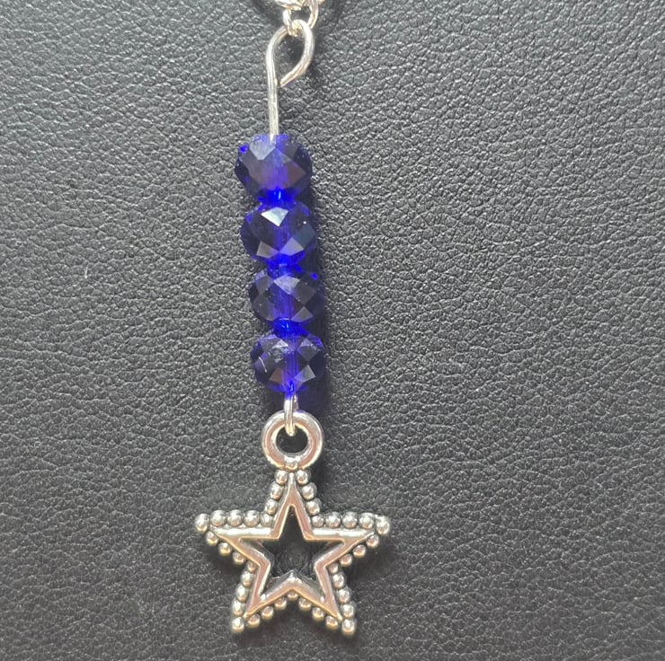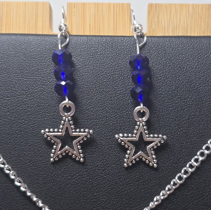 The necklace and matching earrings have been made using round dark blue fire polished glass beads, at the bottmom of the beads is a silver dotty star charm which is 18x15mm