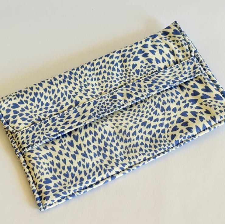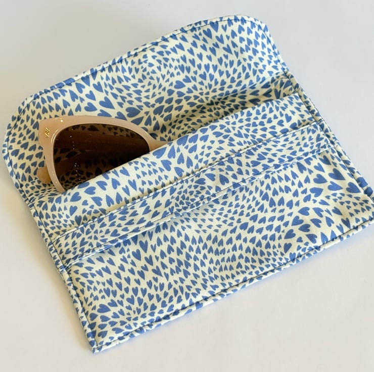 This handmade item is made from a lovely blue hearts fabric. The case has a fold over flap which tucks into a fabric band, keeping glasses snug and secure. The case is padded for extra lens protection.