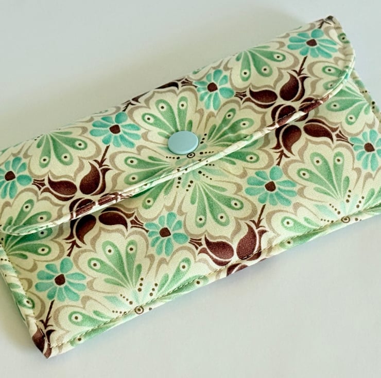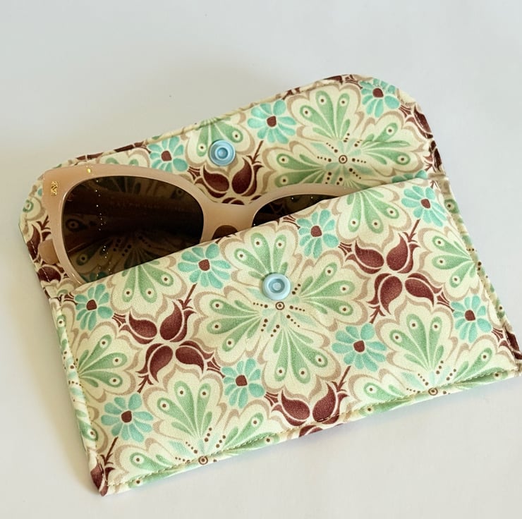 This handmade item is made from a pretty green, cream and brown fabric. The case is fastened by a snap popper, keeping glasses snug and secure, and is padded for extra lens protection.