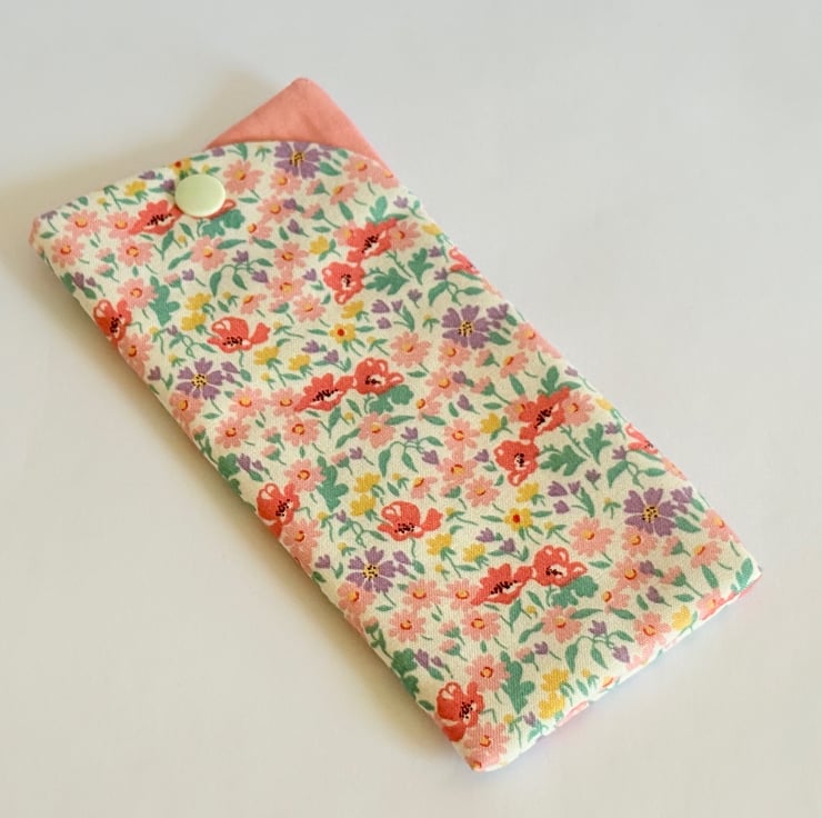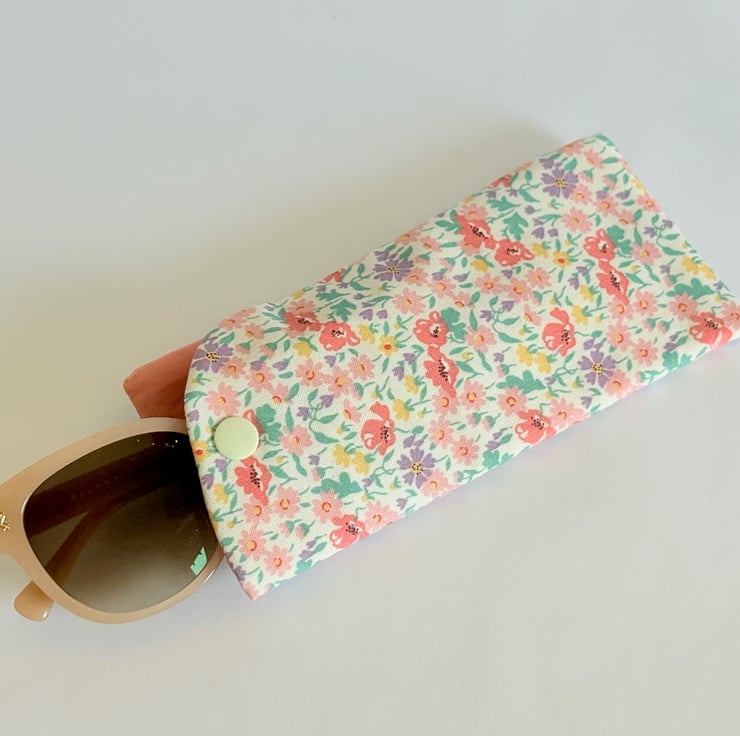This handmade item is made from a lovely Liberty floral cottonfabric. The case is fastened by a snap popper, keeping glasses snug and secure, and is padded for extra lens protection. It has a contrasting peach lining.