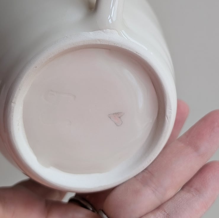 I bisque fired the mug, hand painted it with underglaze colours and then it was clear glazed and fired to earthenware temperatures in my kiln.