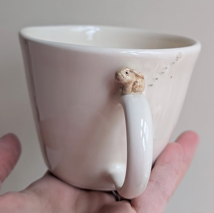 A hand made ceramic mug made on my wheel. I added a tiny beige lop earred bunny and footprints on the cup and handle.