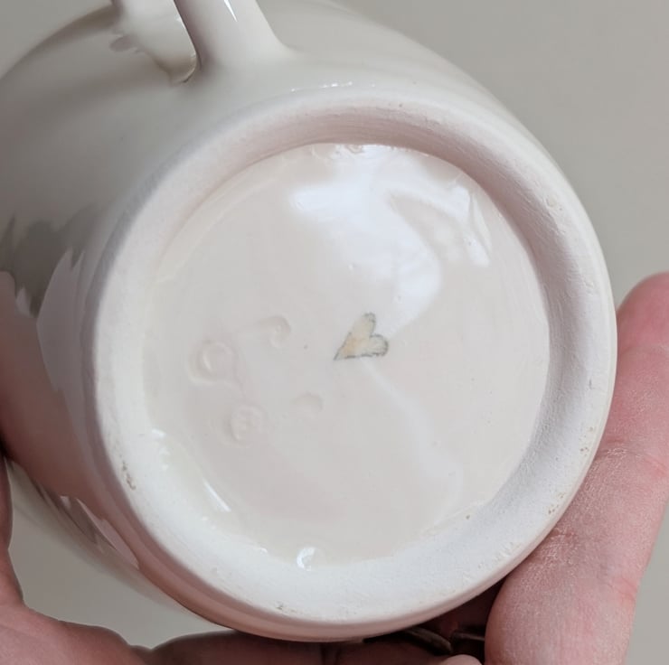 I bisque fired the mug, hand painted it with underglaze colours and then it was clear glazed and fired to earthenware temperatures in my kiln.