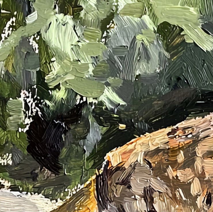 Standing in dappled sunlight, the cat’s golden fur glows warmly against the cool-toned background of lush green foliage. Meanwhile, the artist’s thick, textured brushstrokes add depth and energy, making the scene feel rich and full of life.