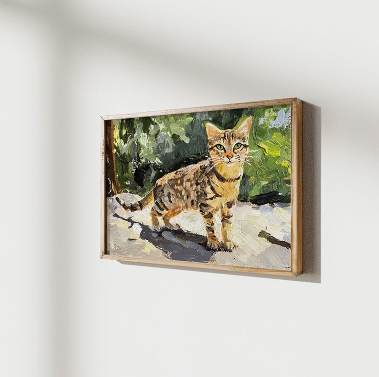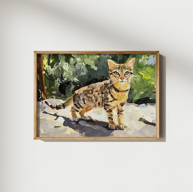 Furthermore, the bold interplay of light and shadow creates a dynamic composition, highlighting the feline’s effortless elegance. Every brushstroke captures the grace of a cat basking in the warmth of the outdoors. Whether displayed in a cozy home, an art-inspired office, or a pet lover’s collection, Tabby Cat in Sunlight Oil Painting brings warmth, charm, and personality to any space.