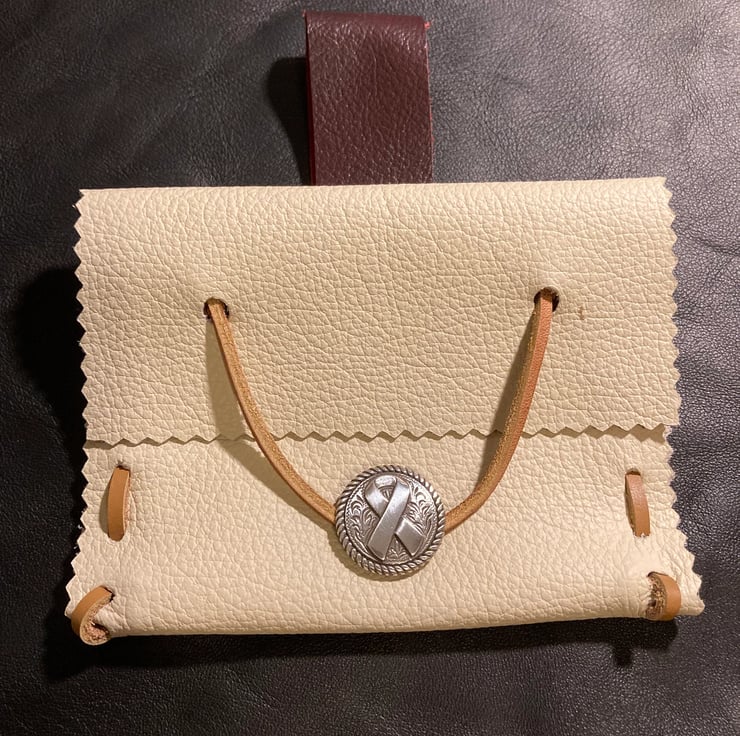 Dimensions: 5” wide, 3.5” in height. Belt loop on back will fit up to a 2" wide belt. Pouch is ivory white coloured leather. Belt loop is dark cherry in colour. Leather weight is very soft lightweight roughly 1.5 oz. Handstitched with brown latigo lacing. Ribbon design concho (nickel plated).