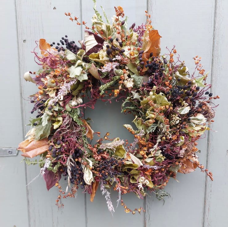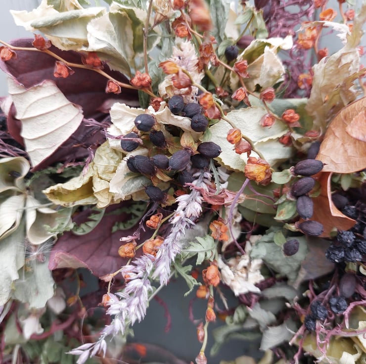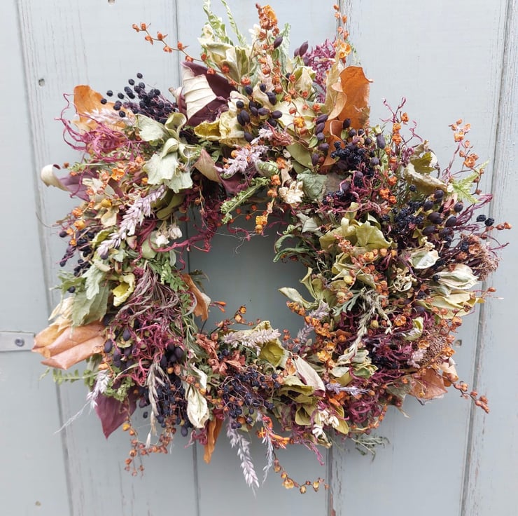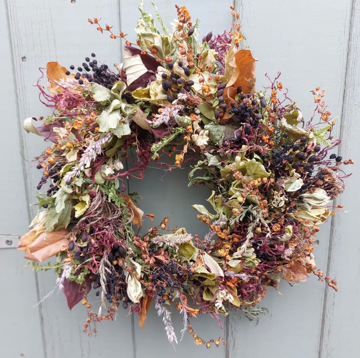 The wreath includes Crocosmia Seed Heads, Acer and Elderberries.