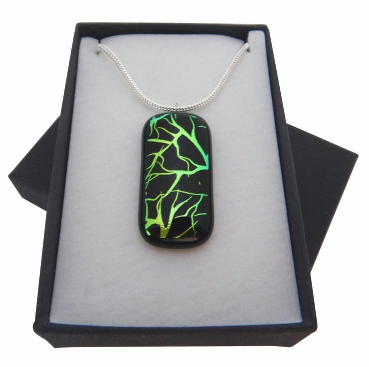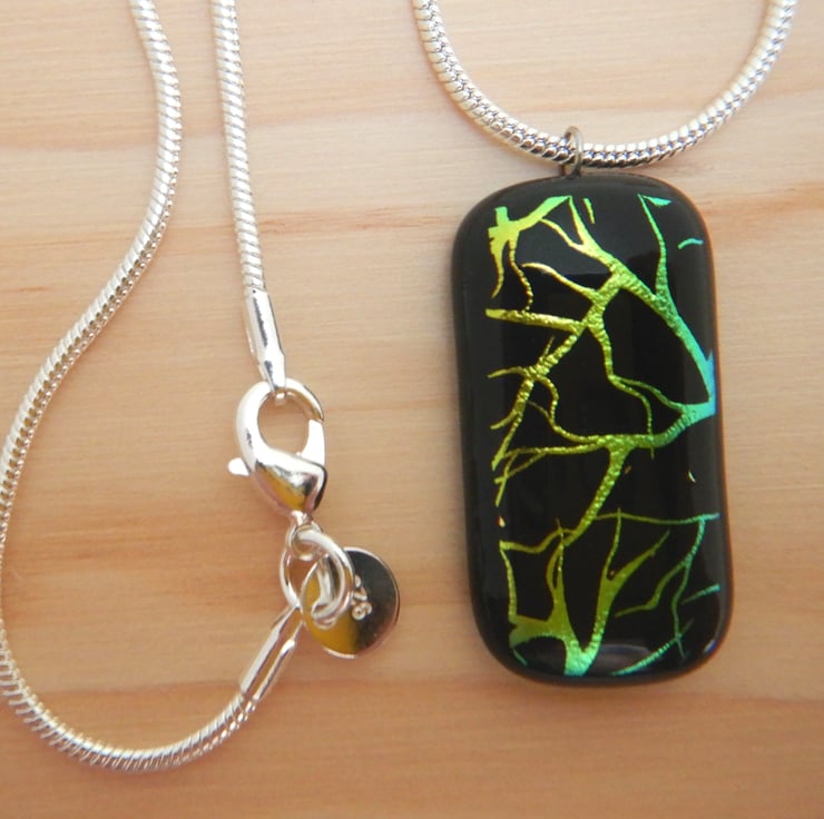 This necklace has been made by fusing together two layers of bullseye glass. The hoop for the necklace is fused between the two layers making it impossible to break off.
