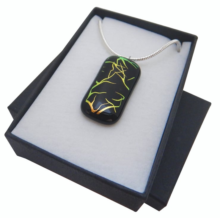 This necklace has been made by fusing together two layers of bullseye glass. The hoop for the necklace is fused between the two layers making it impossible to break off.