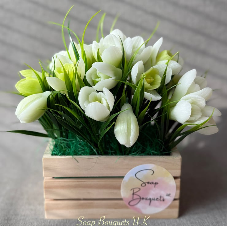 Includes: Handmade soap flowers, artificial greenery, rustic wooden crate, and gift wrapping
