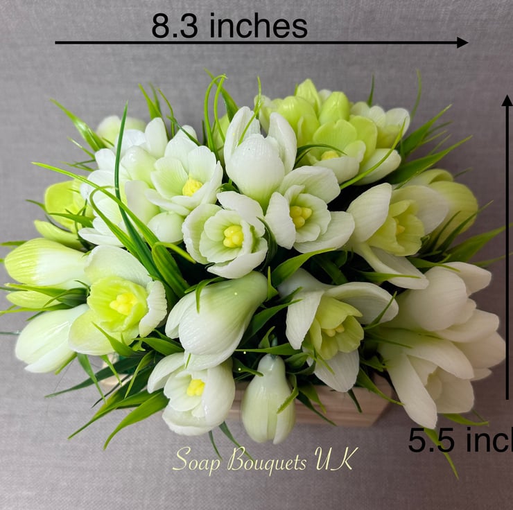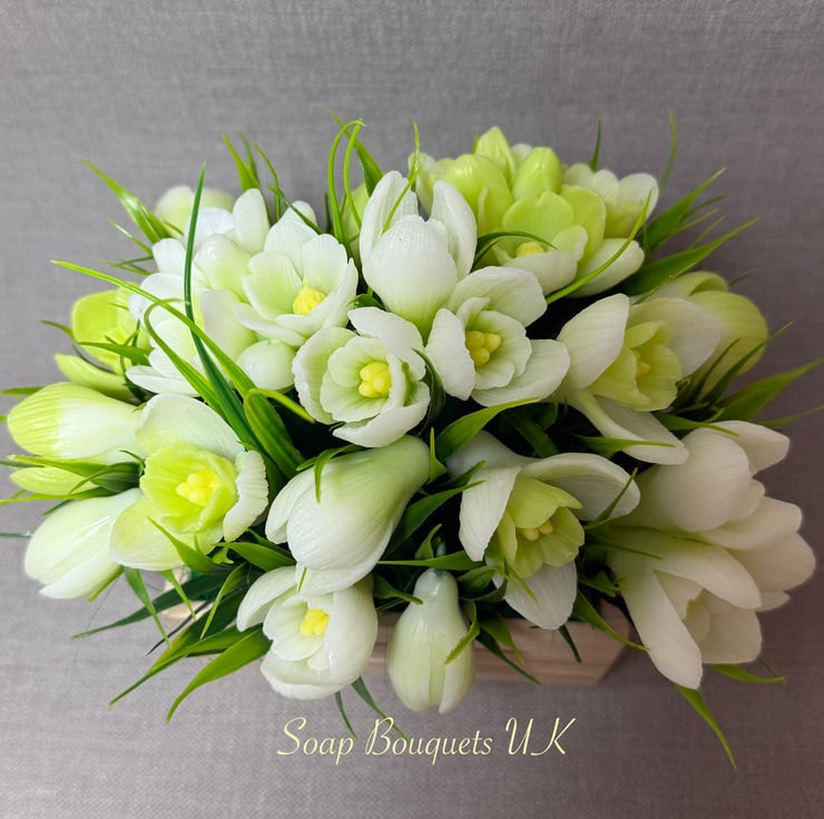Transform your self-care routine with this exquisite handmade soap flower set, designed to resemble delicate snowdrops. Crafted with attention to detail, these soap flowers add beauty and relaxation to any space while offering a luxurious spa-like experience.