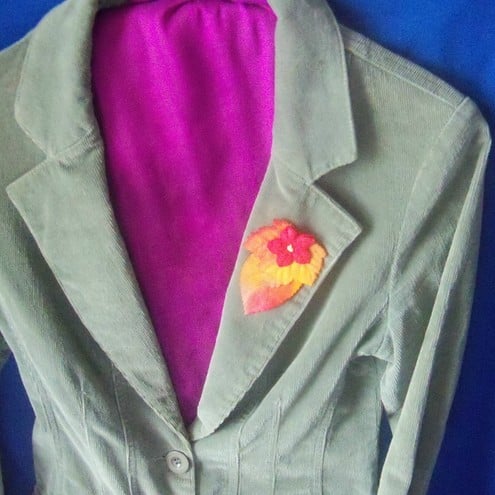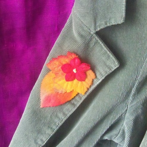 A soft, seasonal brooch in glowing autumn colours, assembled from cotton leaf and flower pieces.