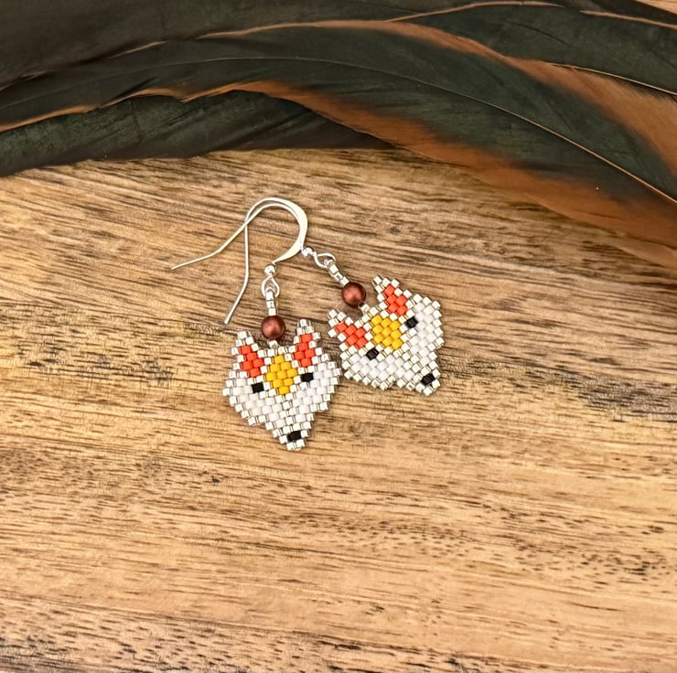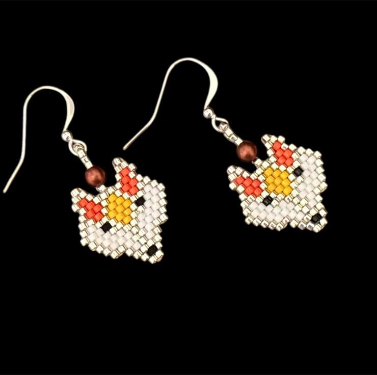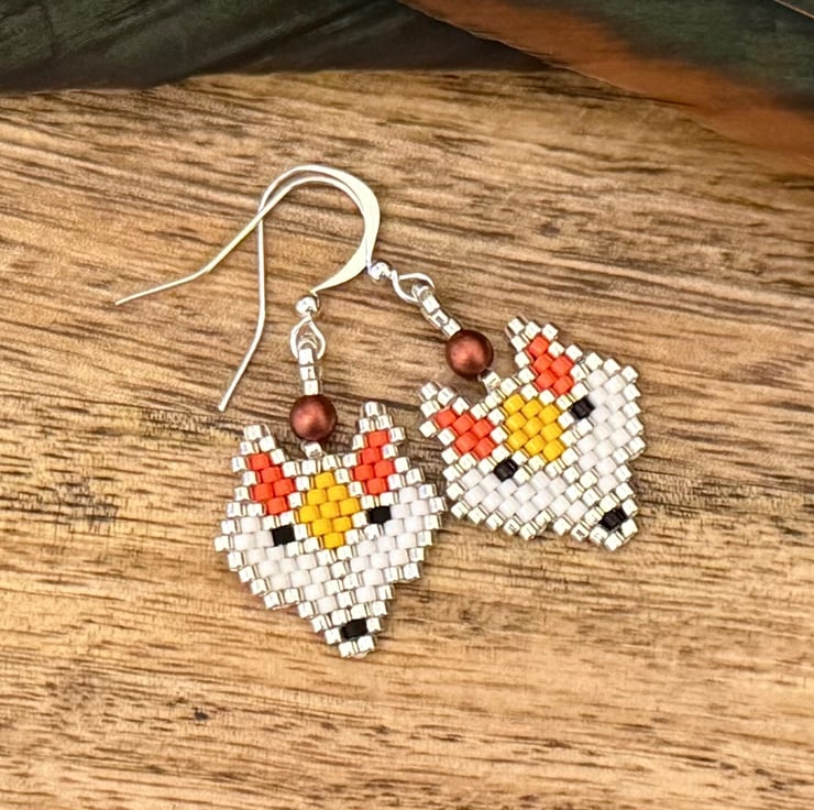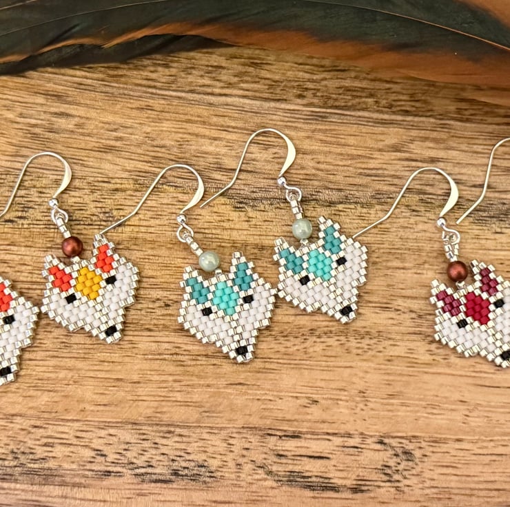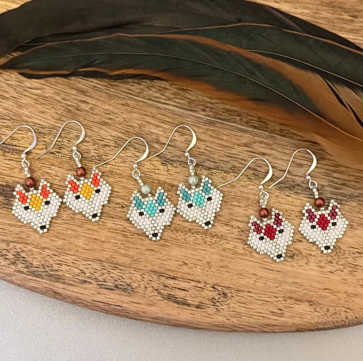 Handmade fox earrings made with tiny Miyuki seed beads that are hand woven together to form the image of a little geometric style fox face. The foxes have been designed and handmade by me in 3 different colours, orange, blue or red (as shown in the photographs.)