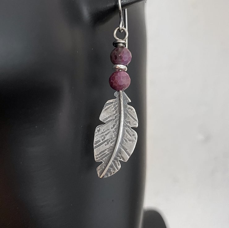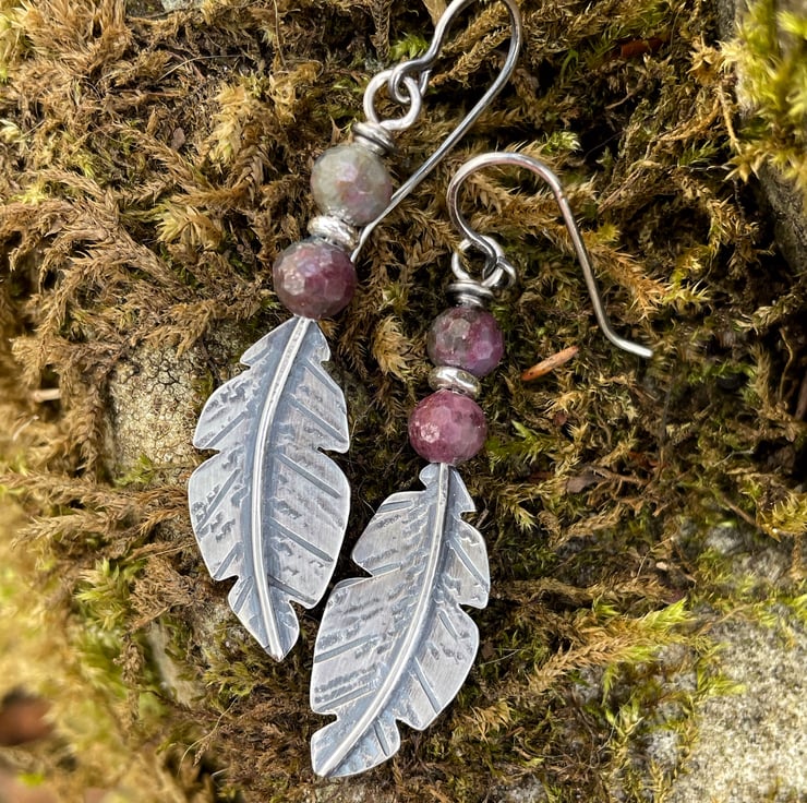 Handmade silver feathers with intricate detailing are topped with gorgeous micro faceted ruby fuchsite beads to make these earring dangles.