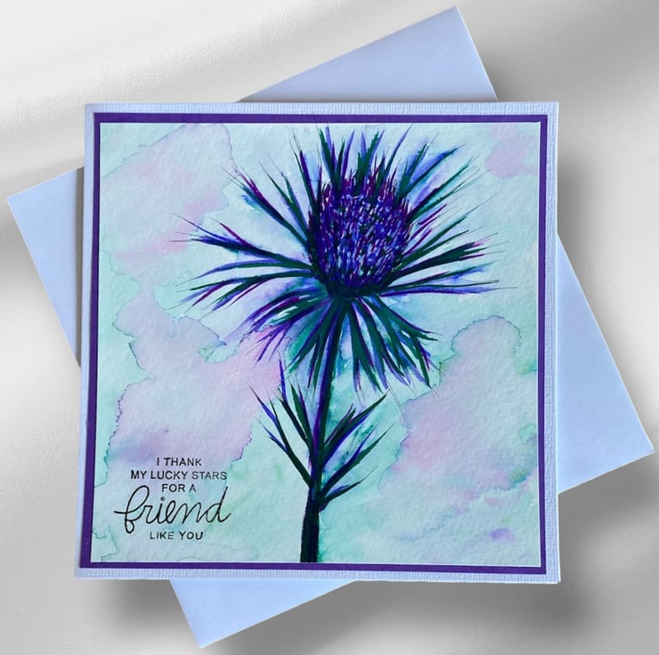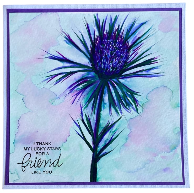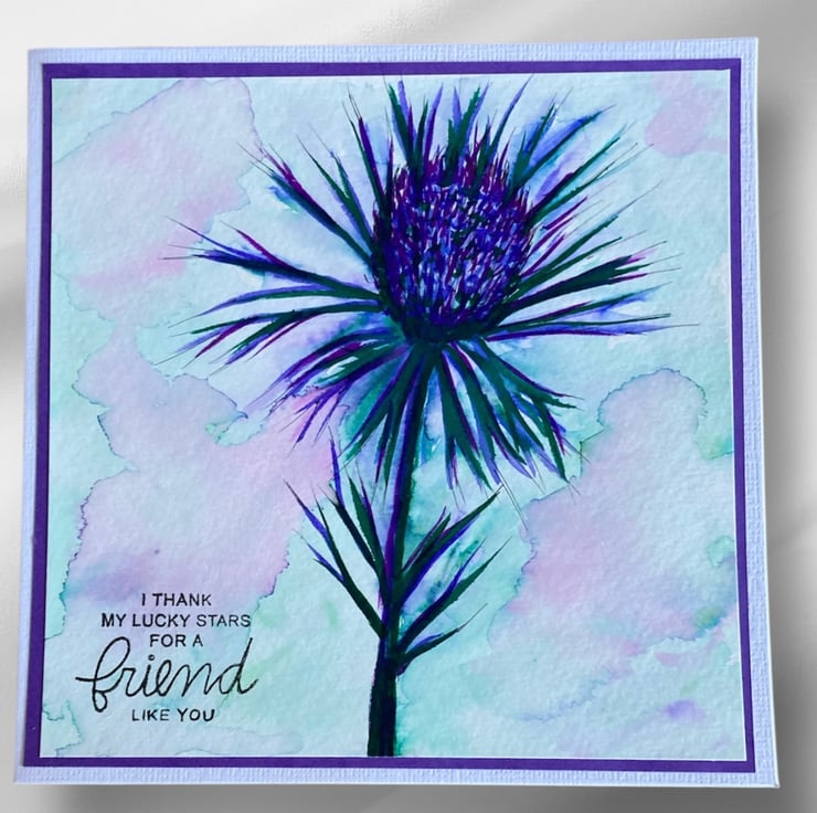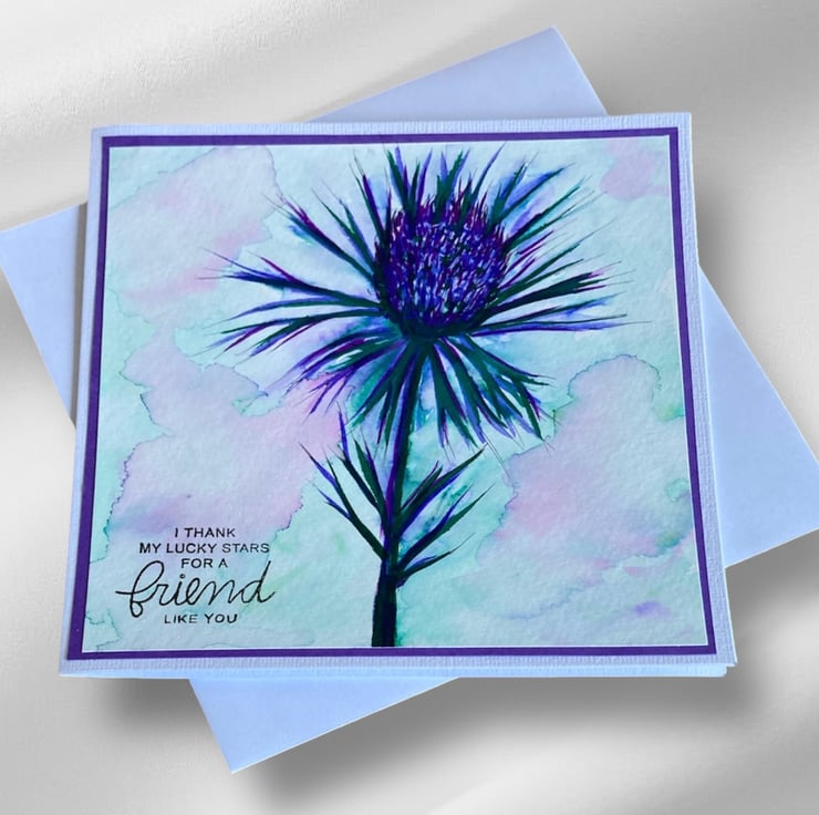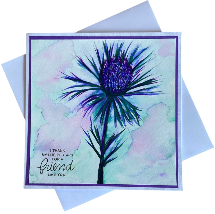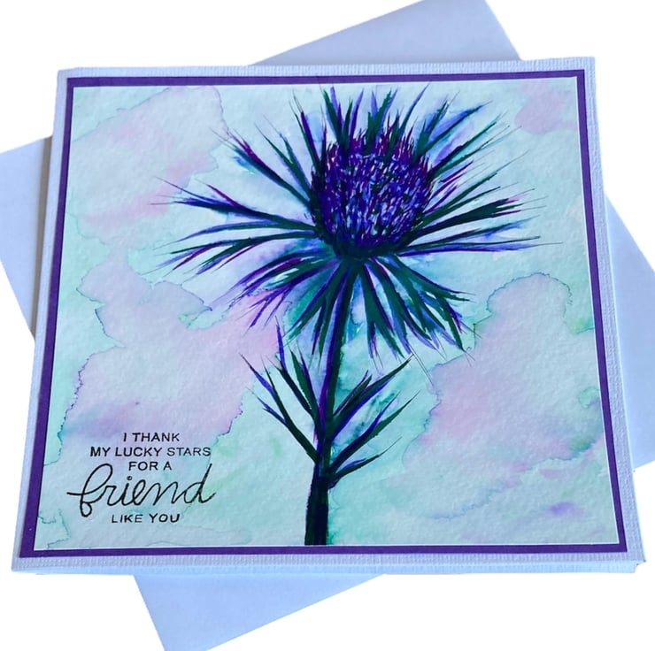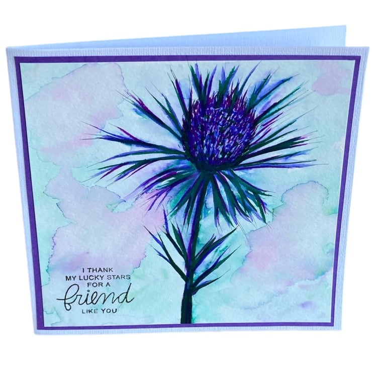 Hand painted using watercolour, this image of a thistle has been layered onto purple card and a white linen card base. The card has been hand stamped with the words I Thank My Lucky Stars For A Friend Like You.