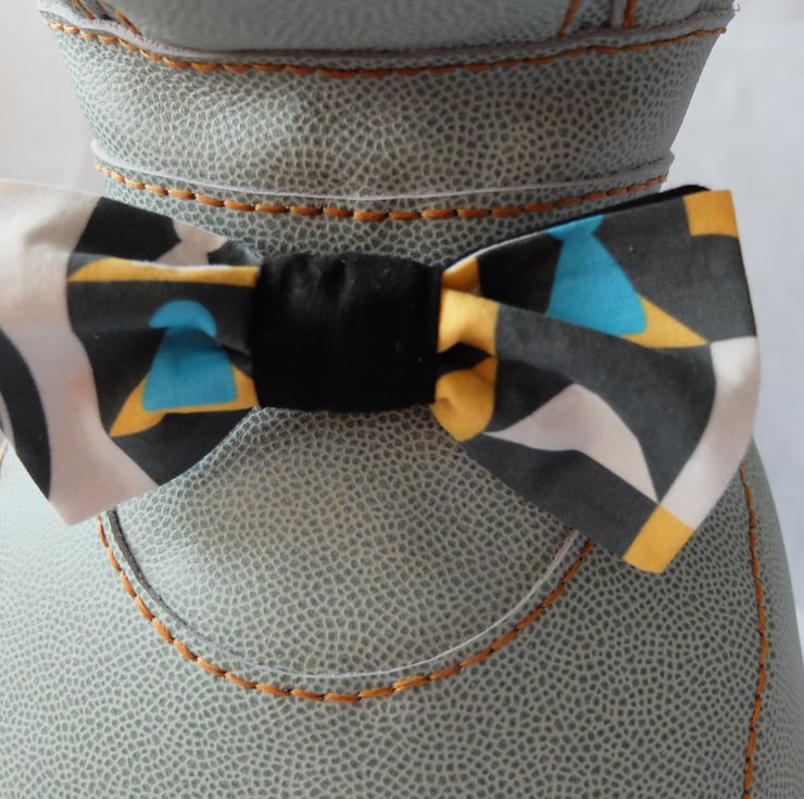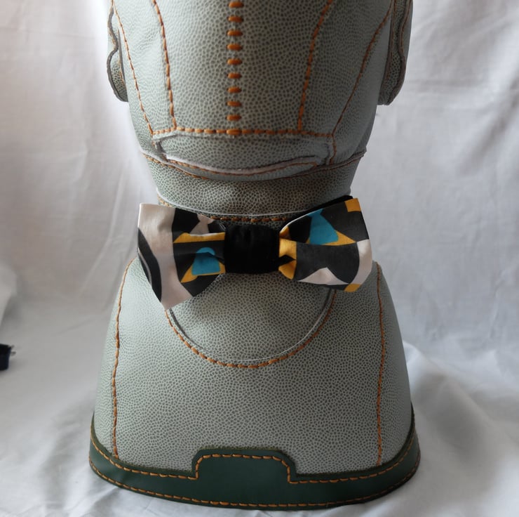 Ready-tied bow tie with adjustable band and hook fastening at back.