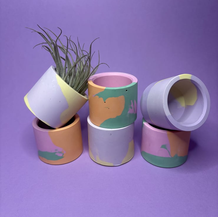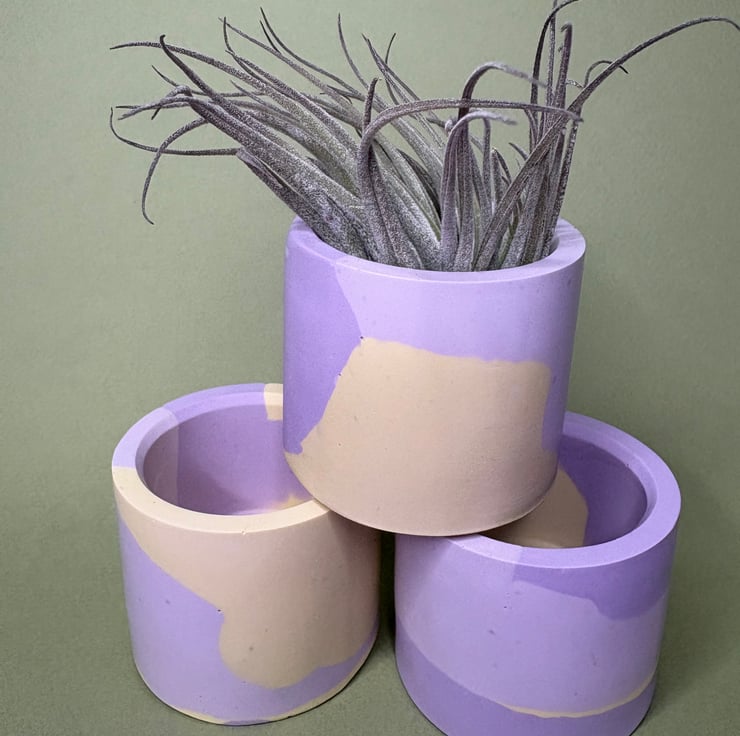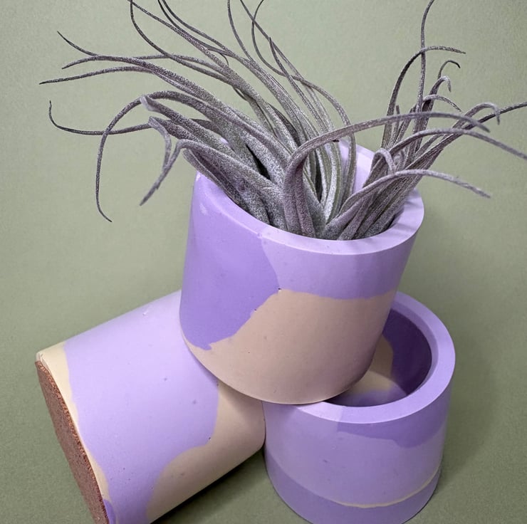 The pieces are cast, sanded and then finished with a vegan coconut and soy wax. The pots are splash proof but not intended to get wet so air plants are perfect.