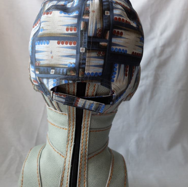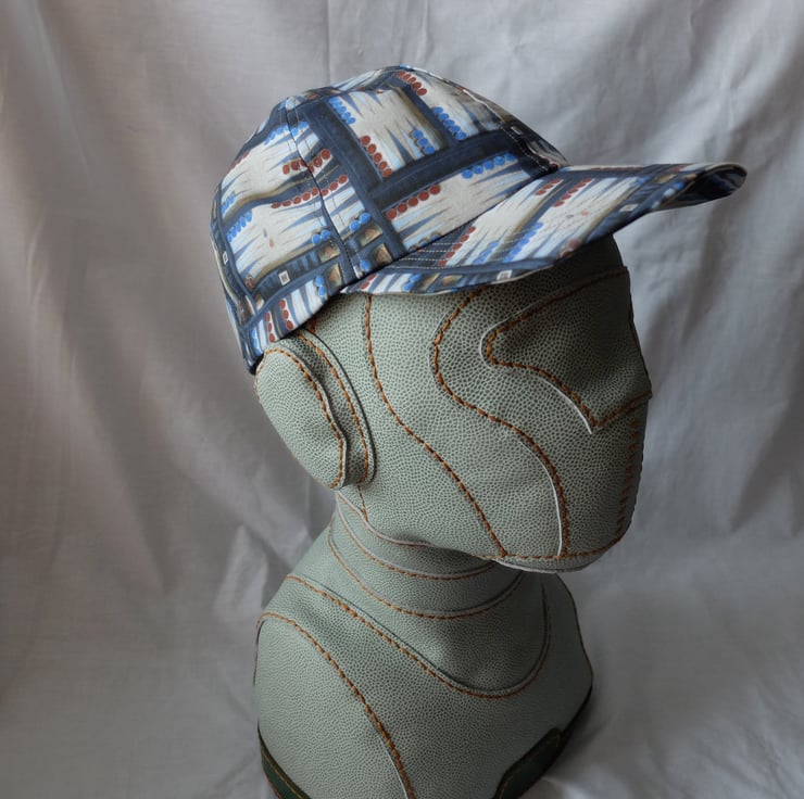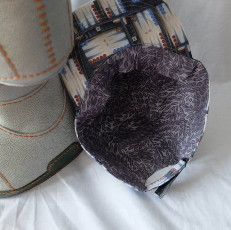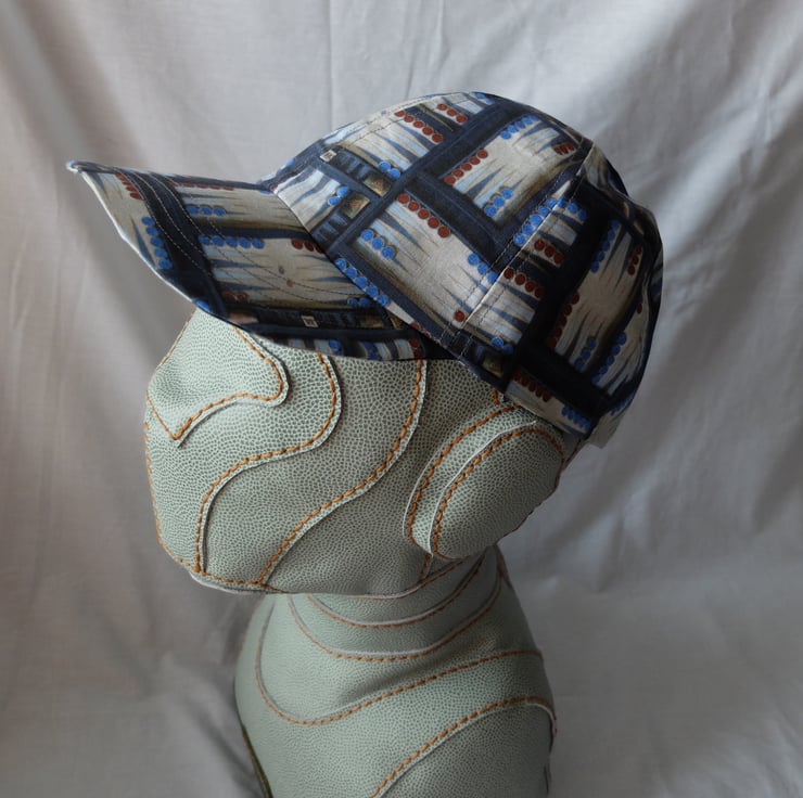 All are made in Backgammon-themed fabric, with a fairly stiff bill. They are lined in contrasting fabric and have a size adjustment at the back using velcro.