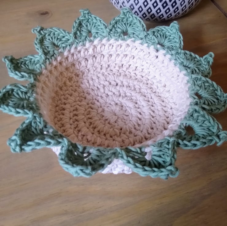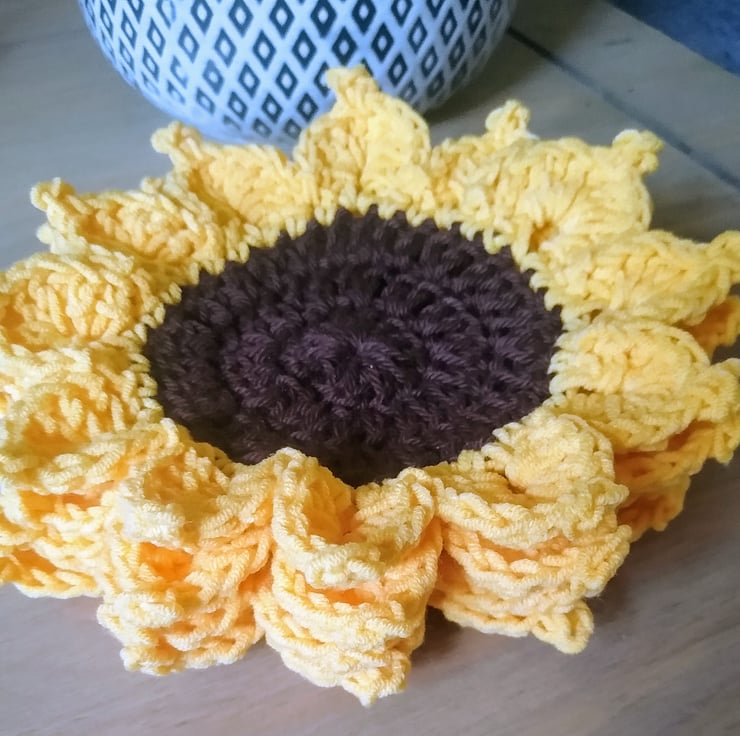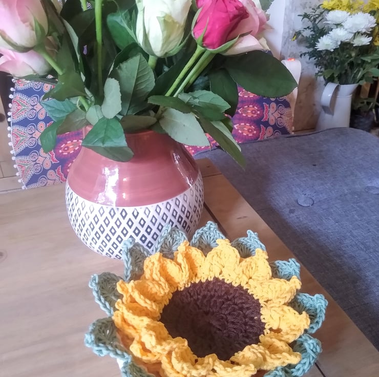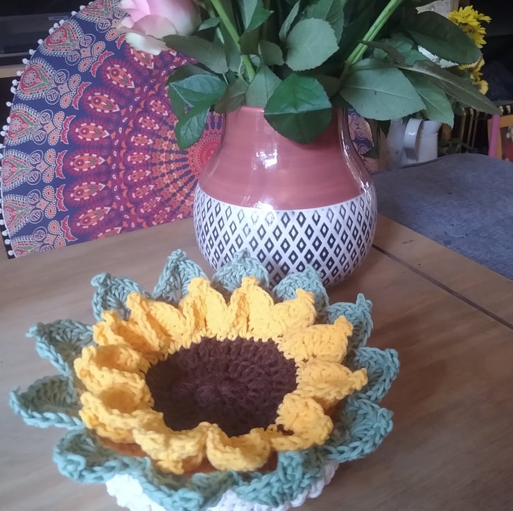 When you order this item you will receive 4 crocheted sunflower coasters made from 100 percent cotton yarn. The coasters have been blocked with stiffening spray to help keep their shape. They are presented in a beautiful crocheted basket that's embellished with 12 leaves that match the sunflower petals. The basket itself is made from two strands of cotton yarn to add strength and help the basket to keep its shape.