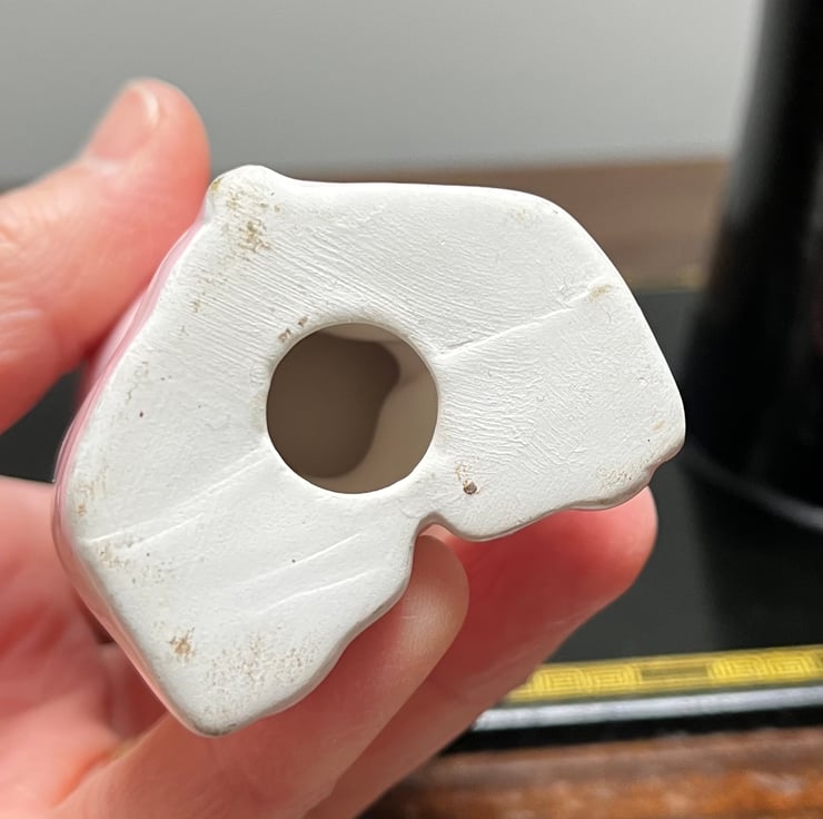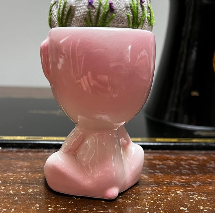 Cute embroidered pincushion in a pink egg cup in the shape of a monkey. The linen cushion has been embroidered with tiny flowers and a bee.