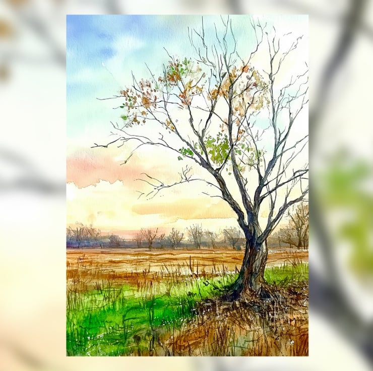 Autumn Tree in Open Field Watercolor beautifully captures nature’s quiet transition into fall.