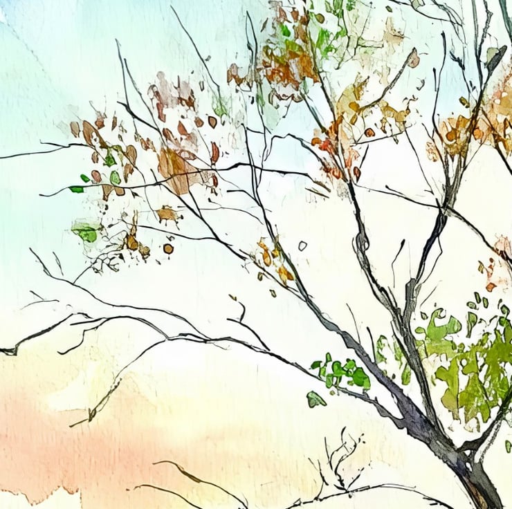 At the same time, the delicate watercolor washes add a sense of fluidity and softness, enhancing the calm, countryside setting. Additionally, the foreground features earthy browns and vibrant greens, symbolizing the shift from summer’s lush growth to autumn’s golden hues. In the distance, fading trees add depth, drawing the viewer’s eye further into the vast open landscape.