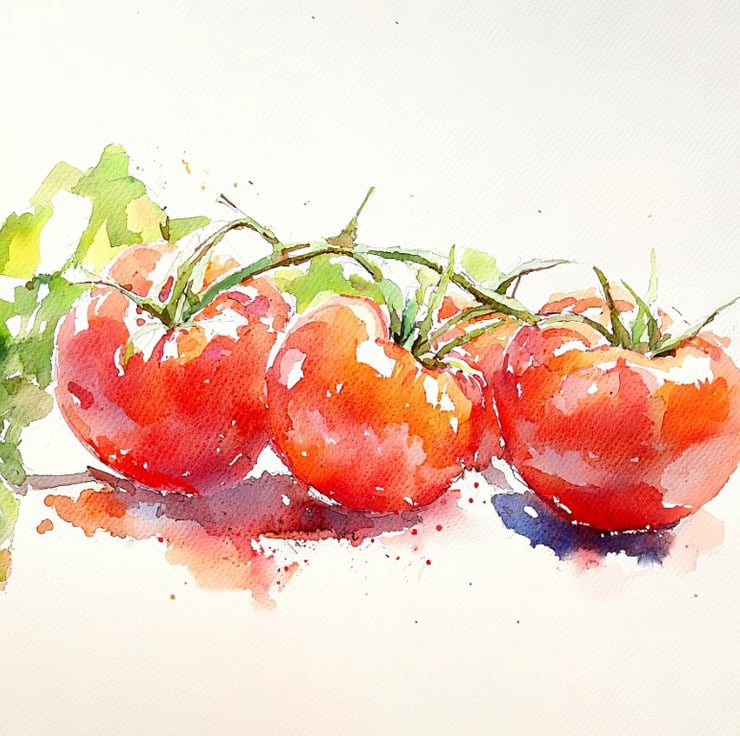 The delicate balance of warm reds, soft highlights, and earthy greens creates a dynamic composition full of energy. The loose brushwork and gentle splattering of paint give the piece a sense of spontaneity and freshness. The crisp white background enhances the vibrancy of the colors, making the tomatoes appear even more luscious and inviting.