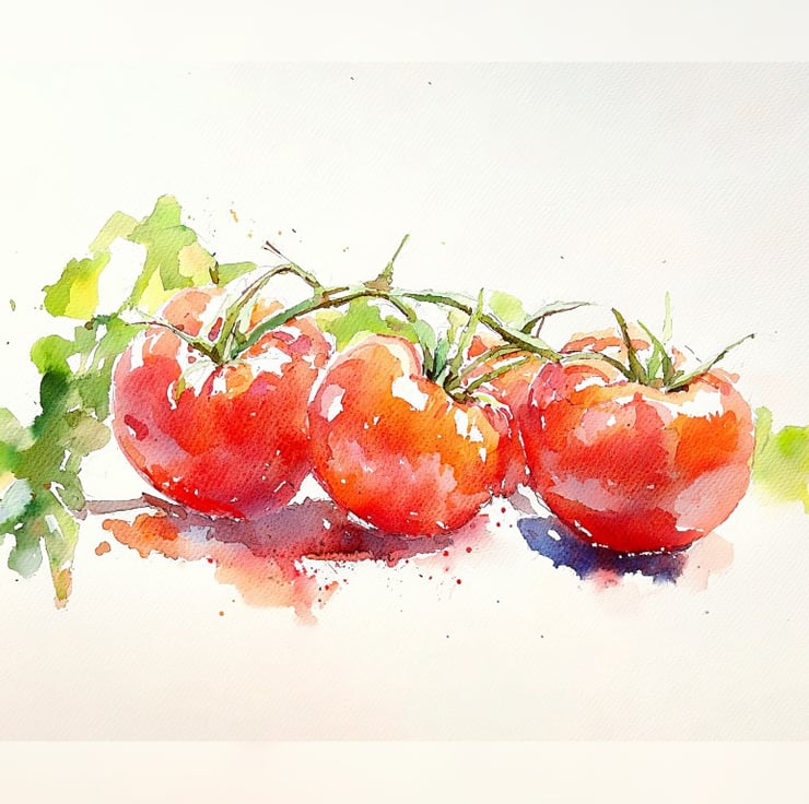 Enjoy the essence of nature’s bounty with this exquisite watercolor, capturing the simple yet stunning beauty of freshly picked tomatoes.