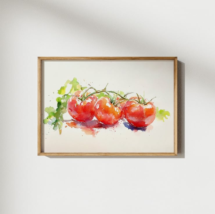 Tomato Watercolor Still Life Painting is a vibrant and refreshing piece that showcases the beauty of fresh produce through fluid brushstrokes and lively colors. The painting features a cluster of ripe, red tomatoes still attached to the vine, with splashes of green leaves adding a natural touch. The transparent watercolor technique enhances the juicy, sun-kissed texture of the tomatoes, giving them a lifelike quality.