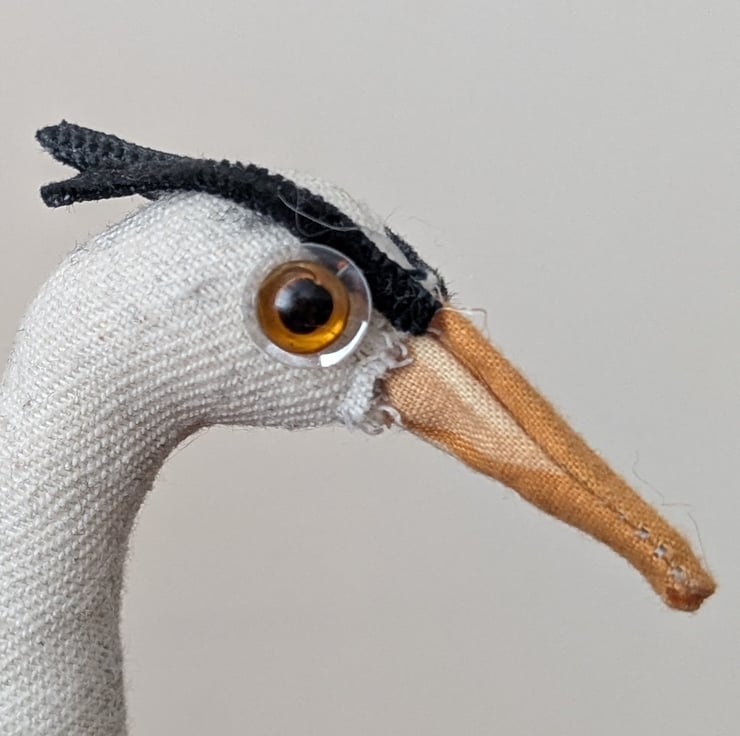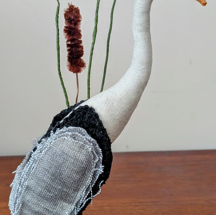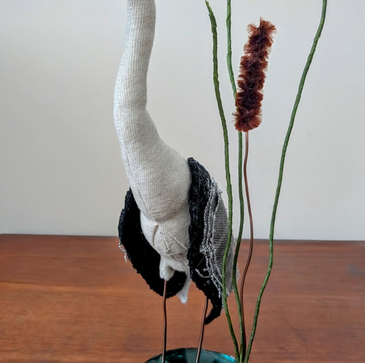 This quirky heron inspired soft sculpture has been handmade from fabric remnants and other recycled materials. Set in a resin base with rubber feet. it is freestanding at approx 25cm height